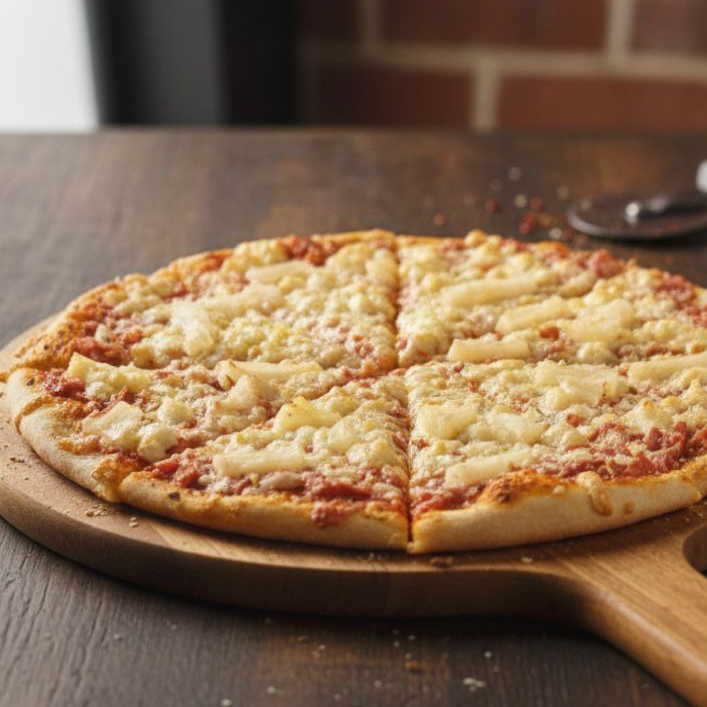 PIZZA DE QUESO, NUESTRA MEZCLA DE QUESOS ....¡PERO AL DOBLE! Elige el nivel de ahumado que prefieras: suave y sutil para realzar los ingredientes, o intenso y robusto ara un sabor mas atrevido. Combinala con nuestras creaciones únicas de aderezos, cada mordida es una exploción de sabor y personalidad.