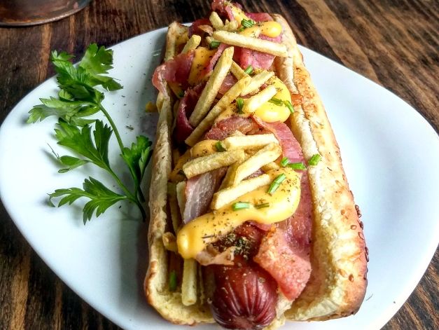 Salchicha de res de 25 cm con papas, perejil, queso cheddar, tocino y especias italianas.