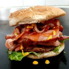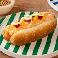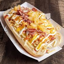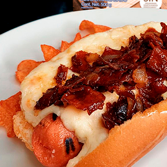 salchicha de pavo, pan brioche, tocino y queso manchego