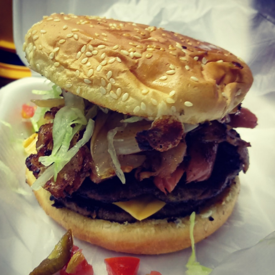Doble carne arrarrachera, tocino, salchicha, queso amarillo, queso manchego, cebolla caramelizada, lechuga, chiles jalapeños y aderezos.