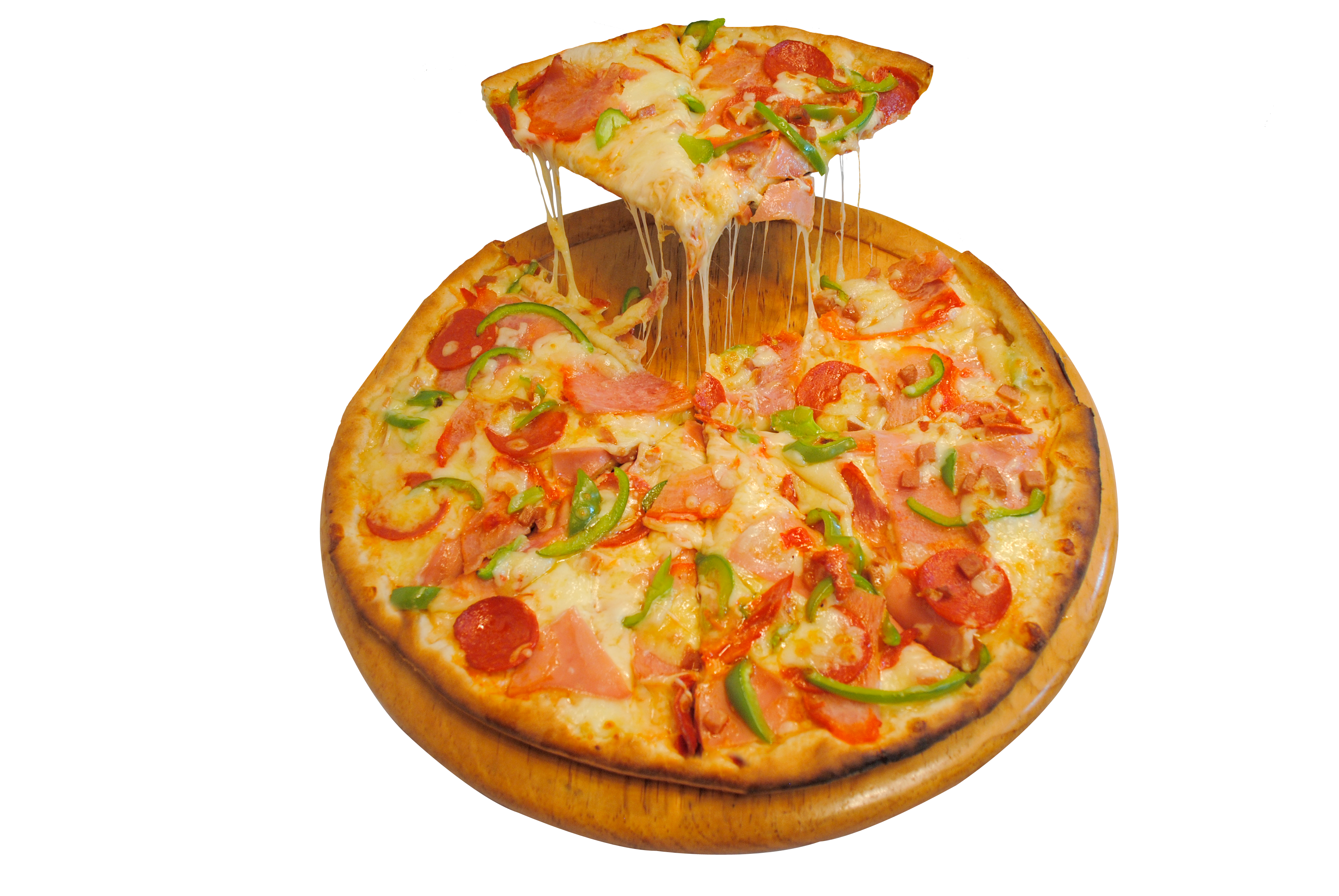 Pizza mediana especial 30 cm con jamón, pepperoni, pimiento, pierna, refresco de 400 ml y otra pizza mediana a elegir.
