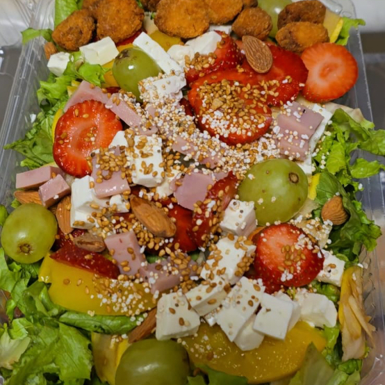 Base de lechuga fresca, 5 ingredientes de barra fría: jicama, fresa, uva, durazno y piña en almíbar , 3 porciones de proteínas:pollo asado, queso panela , jamón de pavo, 2 porciones de toppings: almendras y quinoa y 1 aderezo.