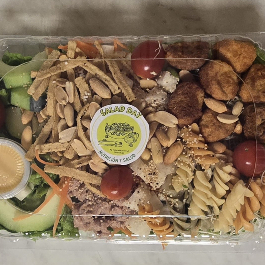 Base de lechuga fresca, 3 ingredientes de barra fría: zanahoria rallada, jicama, pepino 2 porciones de proteínas: croqueta de pollo y panela , 2 porciones de toppings: tortilla de maíz y nuez y 1 aderezo.