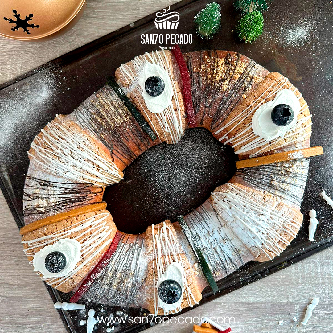 Pastel de vainilla relleno de crema batida y mermelada de fresa, cubierto de betún de chocolate hershey's y granillo de gansito.