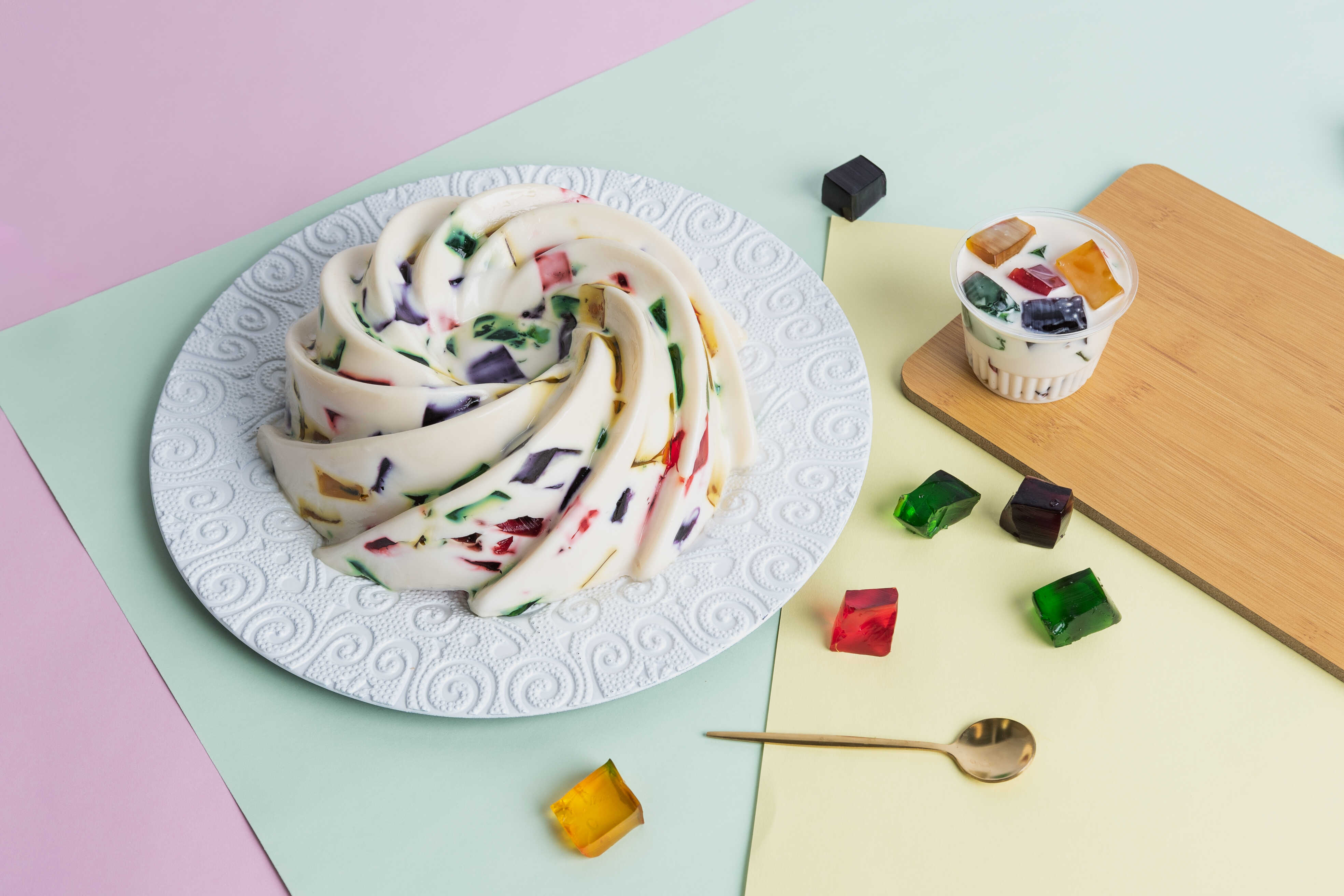 Cubitos de gelatina de fresa, uva, limón y piña envueltos en gelatina de leche.