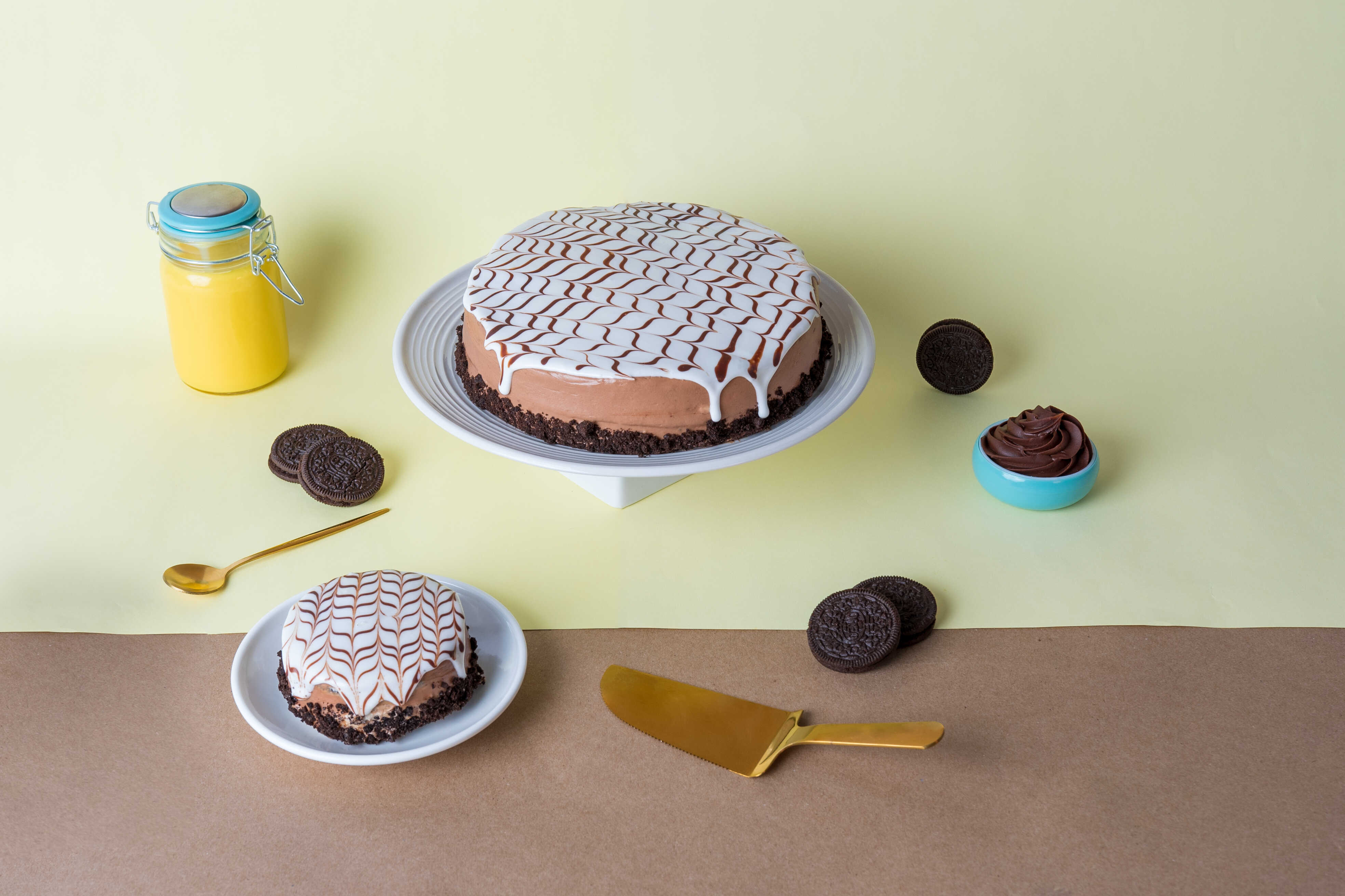 Pastel de chocolate relleno de crema de queso Philadelphia y trozos de galleta Oreo, con cobertura de crema y decorado con galletas Oreo.