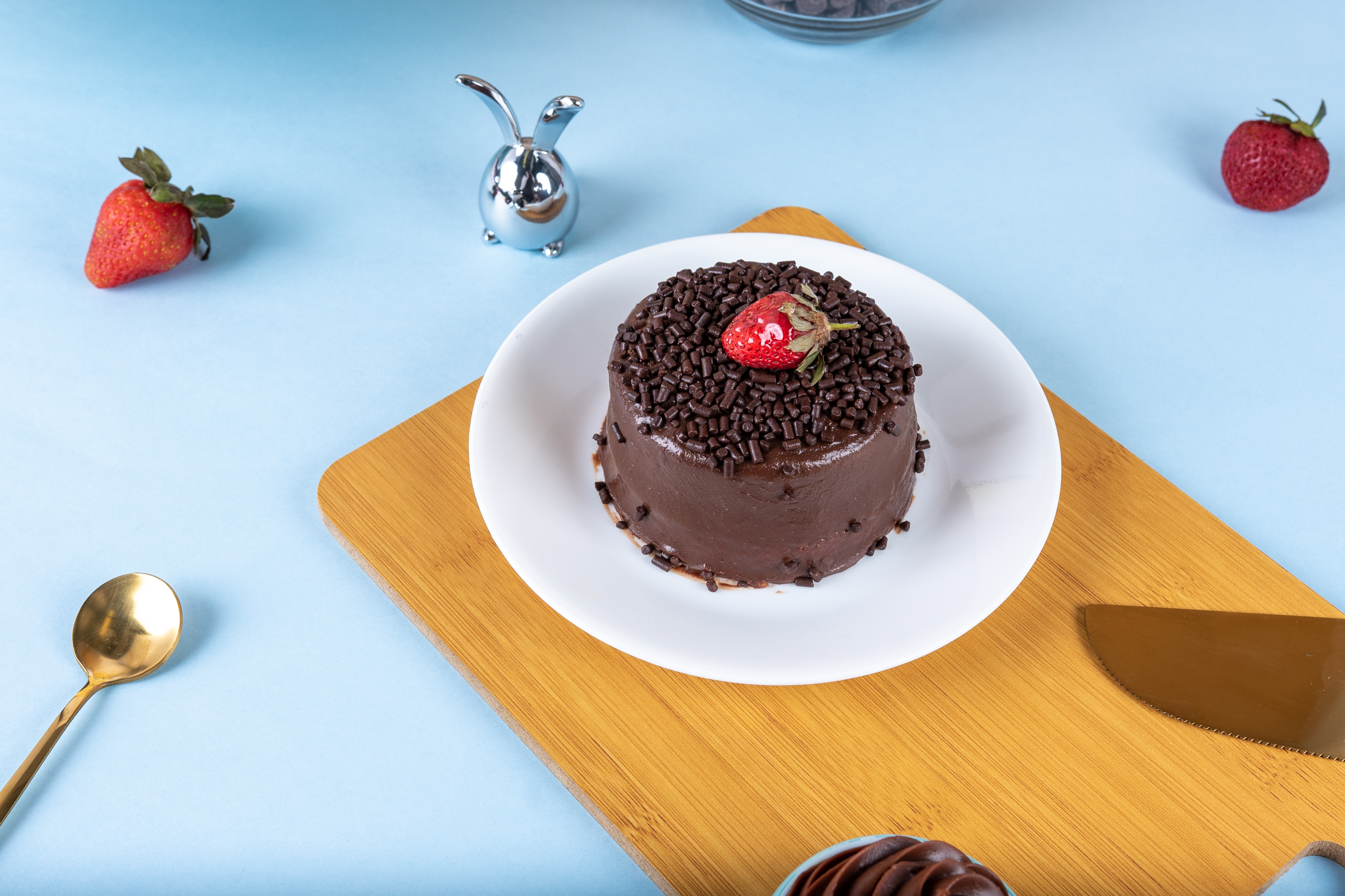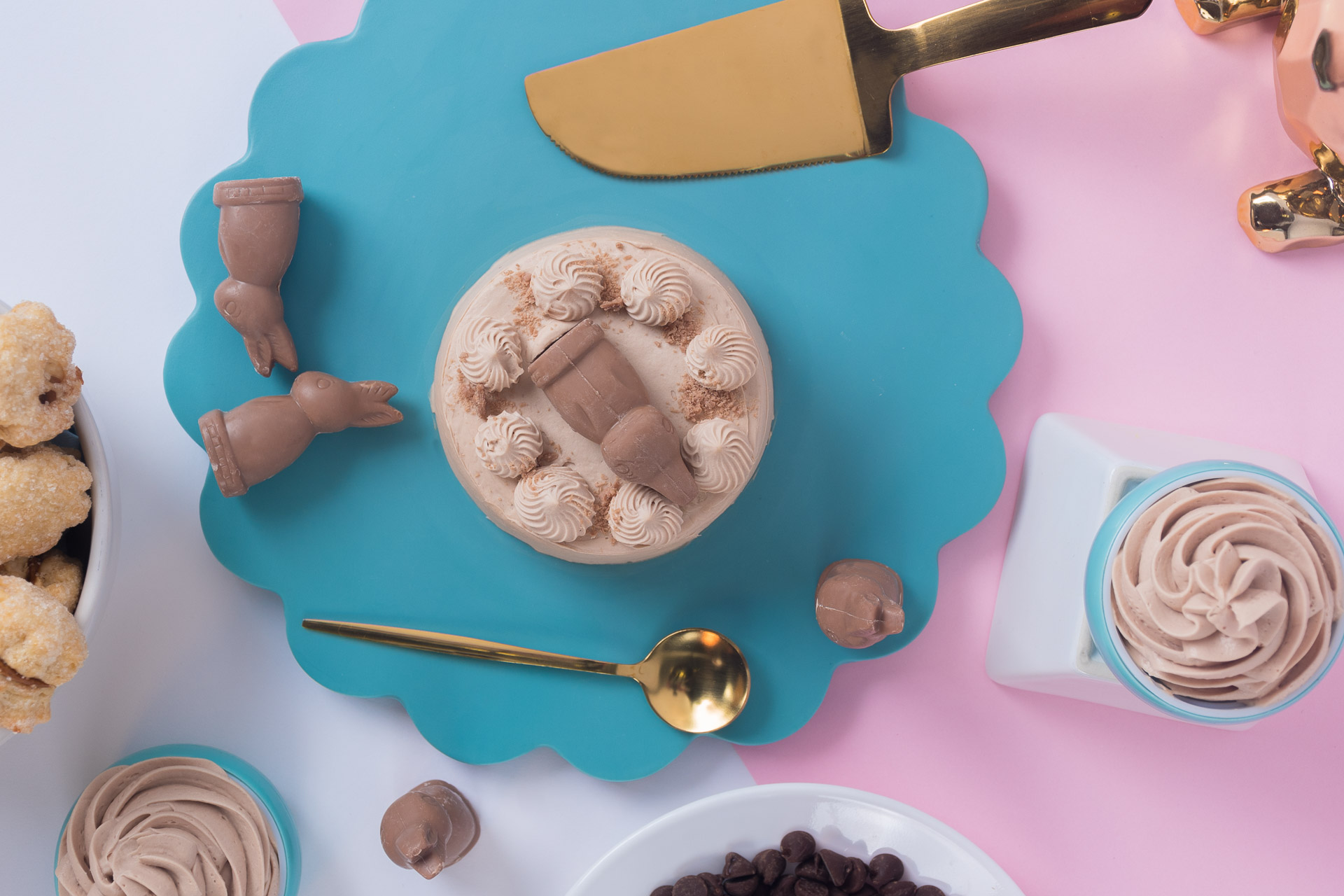 Mini pastel de vainilla con 3 leches, relleno y cubierto de ganache de chocolate Turín de conejito.