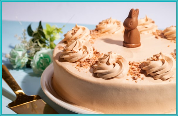 Pan de vainilla con 3 leches conejito, cubierto de ganache de chocolate Turín decorado con Conejito.