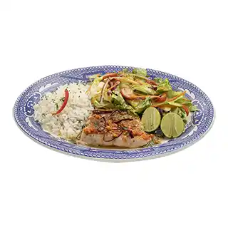 Salmón a la plancha o al Mojo de ajo o al ajillo (200 g). Con arroz blanco y ensalada de la casa.