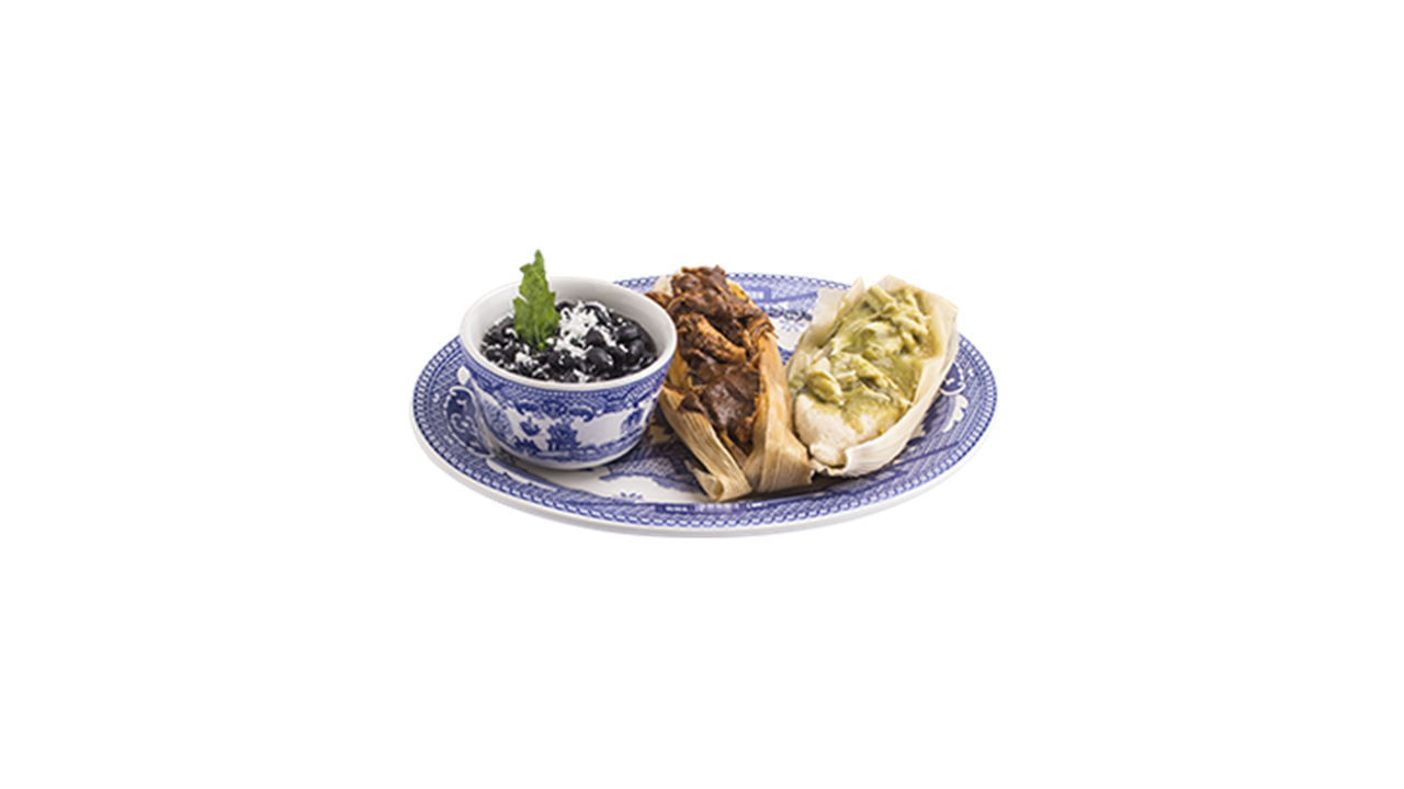 Para 1 persona Tamal de maíz(Rajas con queso o Verdes o Mole o Rojo), Incluye:Frijoles charros (100 ml) o frijoles negros de la olla (100 ml) , incluye:Café Americano (300 ml) o Atole o Chocolate (300 ml) o leche (336 ml)