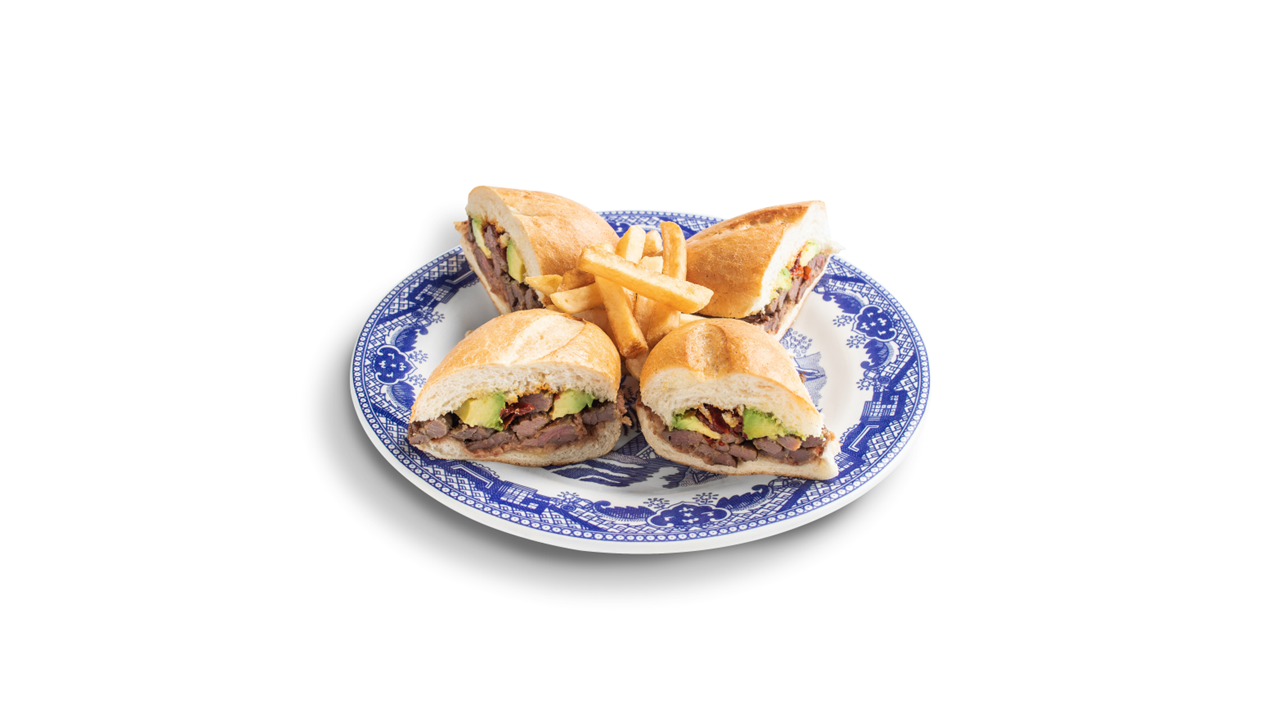 Con Pollo, Jamón, Tocino, Queso Amarillo, acompañado con papas a la Francesa