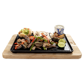 Comal de Fajitas de arrachera con pimiento morrón rojo y verde, guacamole y chiles toreados 150 g