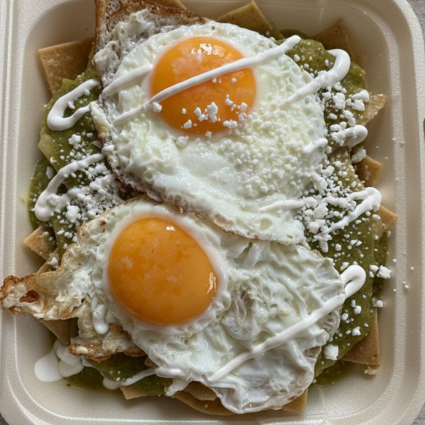 Totopos con dos huevos bañados con nuestra deliciosa salsa verde o roja, con queso y crema