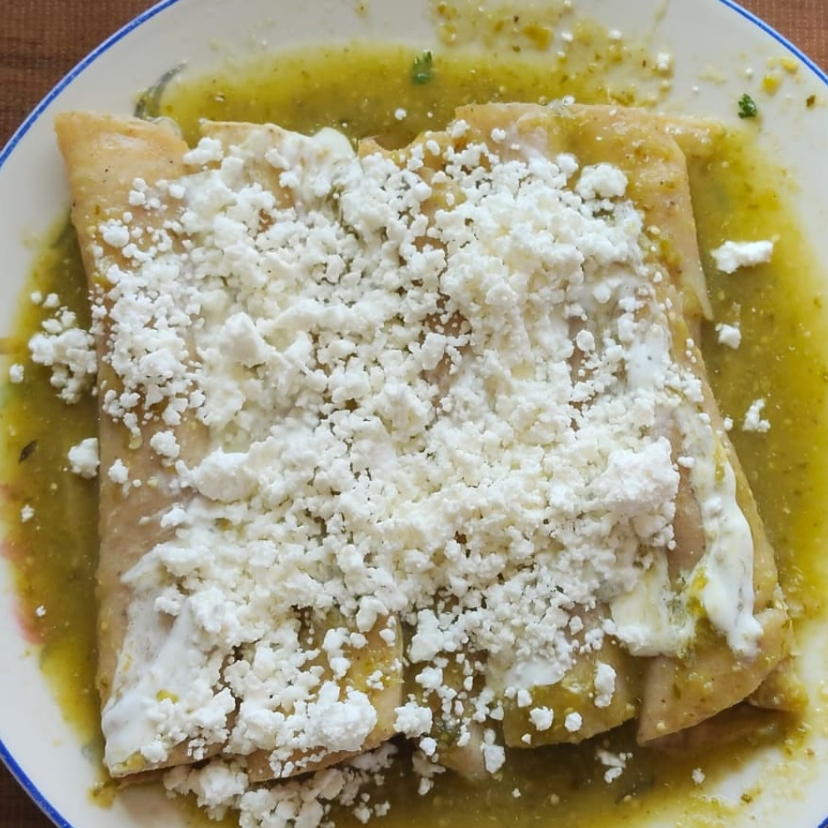 4 pzas de enchiladas rellenas de pollo bañadas en nuestra deliciosa salsa verde o roja, con queso y crema