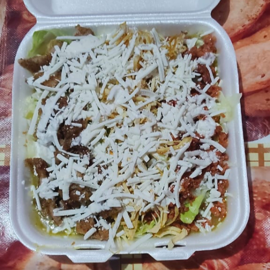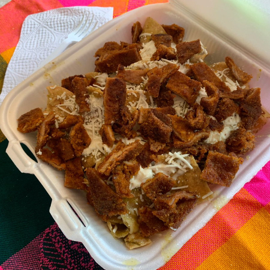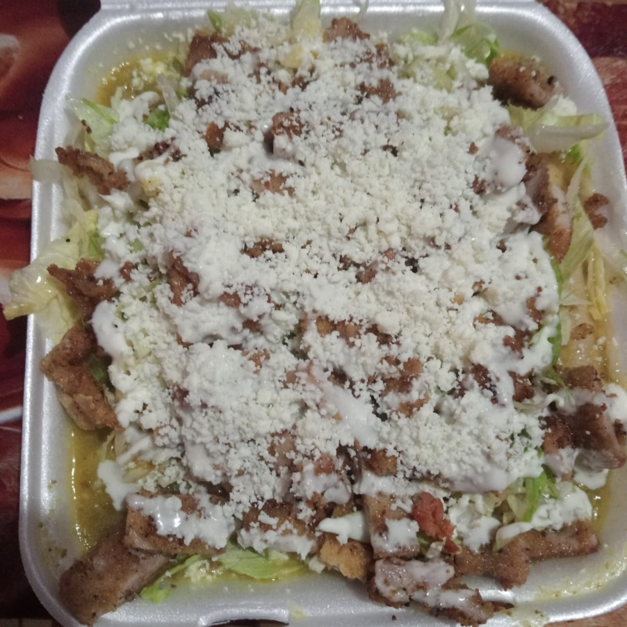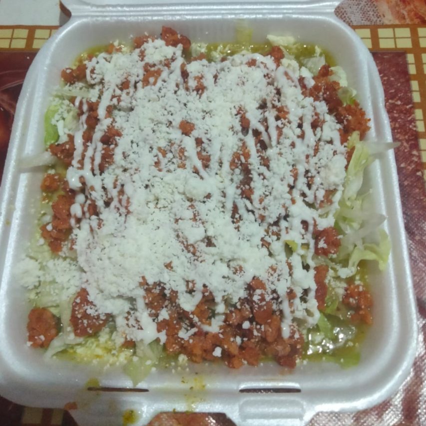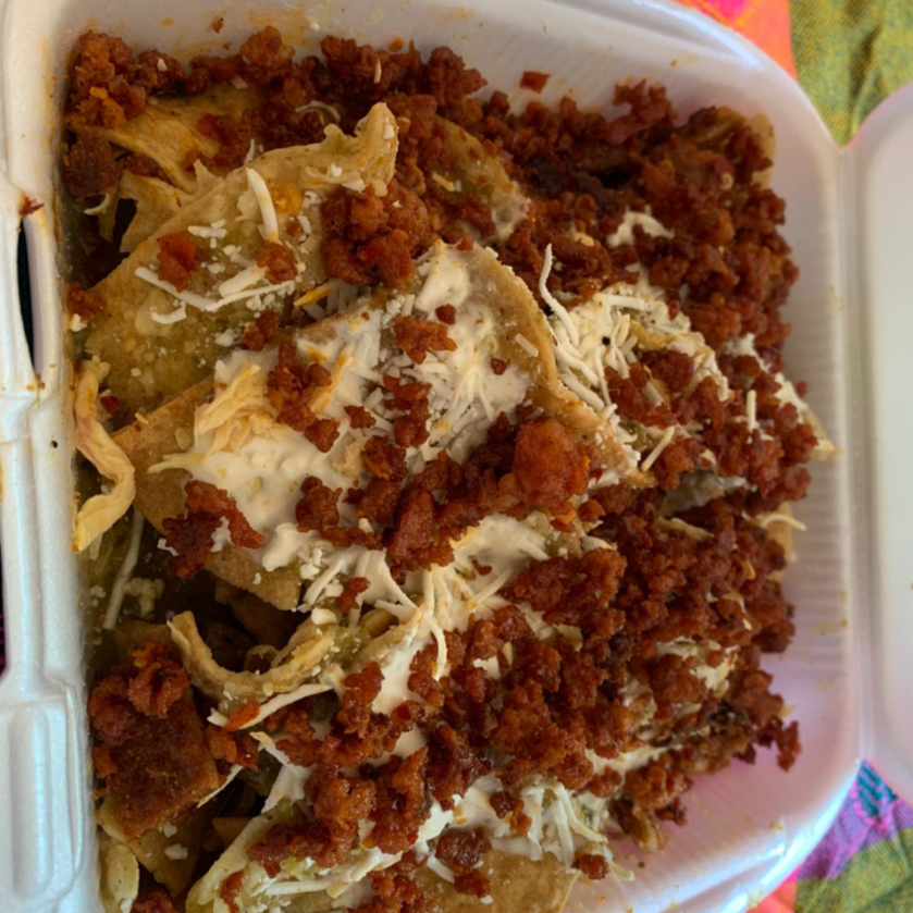 Totopos con milanesa de res bañados en nuestra deliciosa salsa verde o roja, con crema y queso