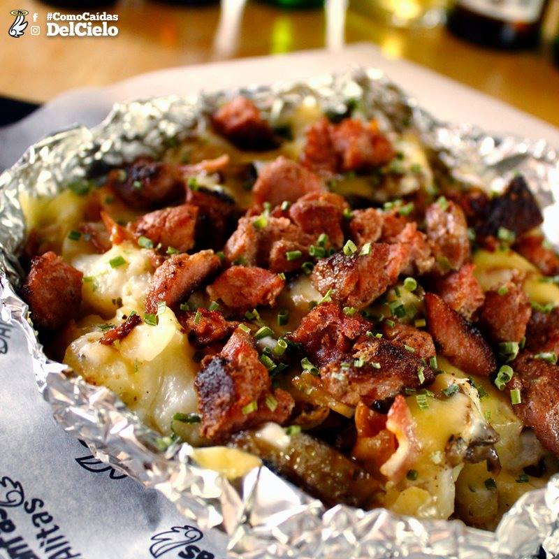 Papa, Mantequilla, Pimienta, Queso . Mozzarella, Champiñones, Tocino, Cebollin y Aderezo Ranch.