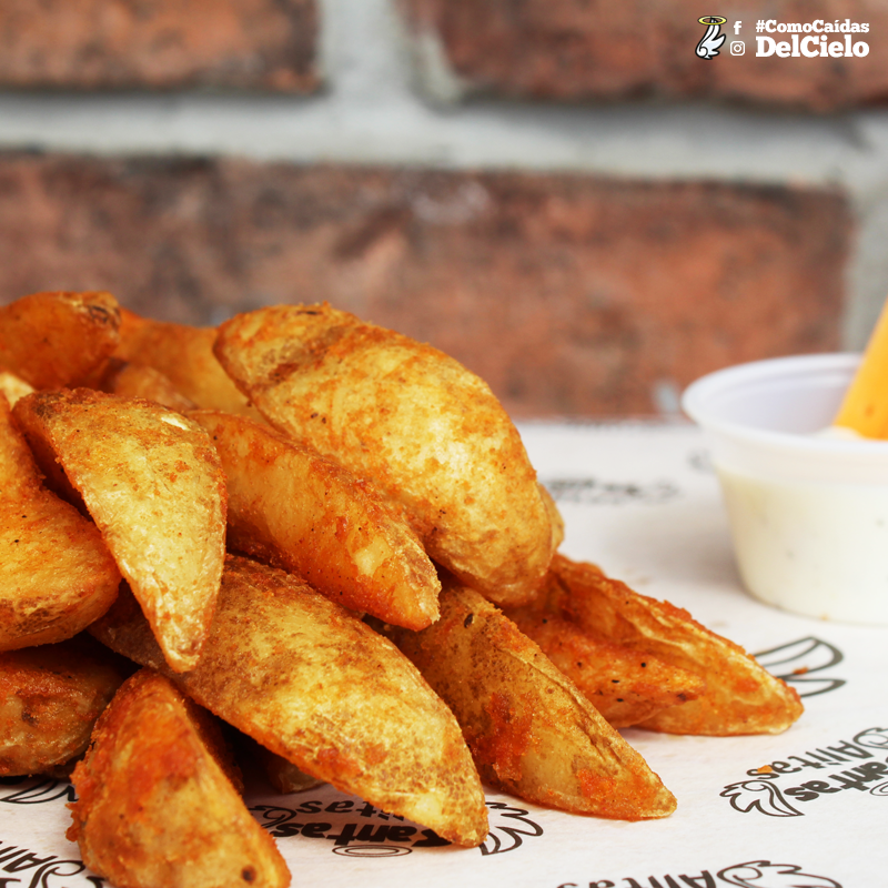 270 gra Doraditos gajos de papa con corteza servidos con aderezo ranch.