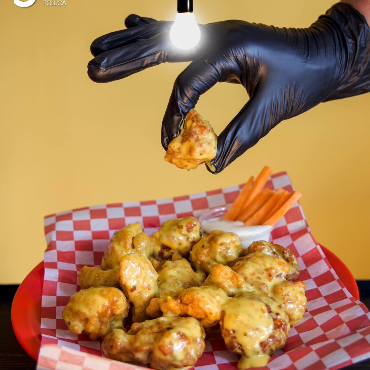 Alitas deliciosas bañadas en 12 deliciosas salsas.