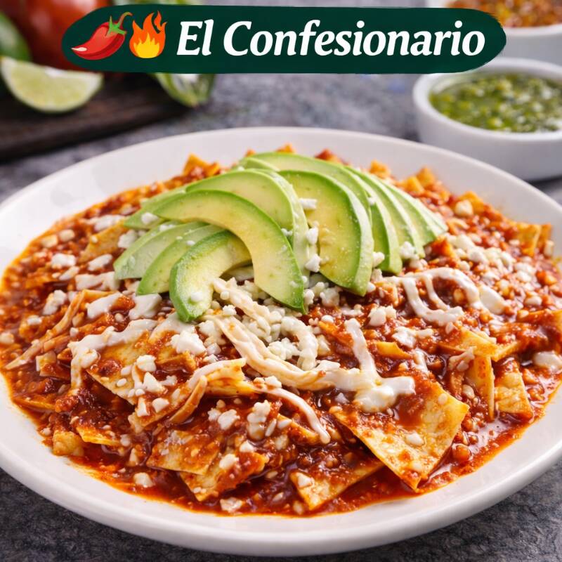 Chilaquiles con pollo deshebrado + aguacate, bañados en salsa verde o roja, con crema, queso rallado, cilantro y cebolla
