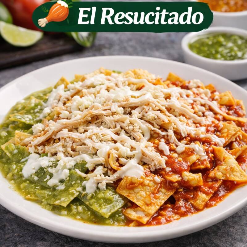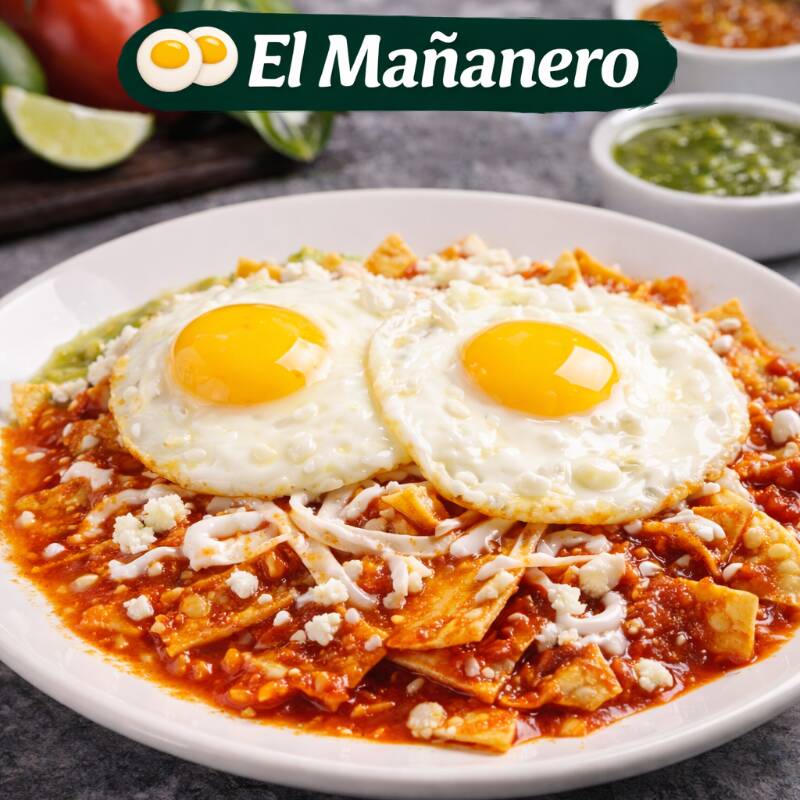 Chilaquiles con pollo + huevo + aguacate, bañados en salsa verde, roja o salsa especial de la casa, con crema, queso rallado, cilantro y cebolla.