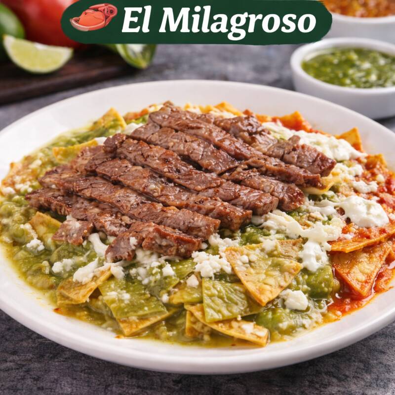 Chilaquiles con bistec de res + aguacate, bañados en salsa verde, roja o salsa especial de la casa, con crema, queso rallado, cilantro y cebolla.