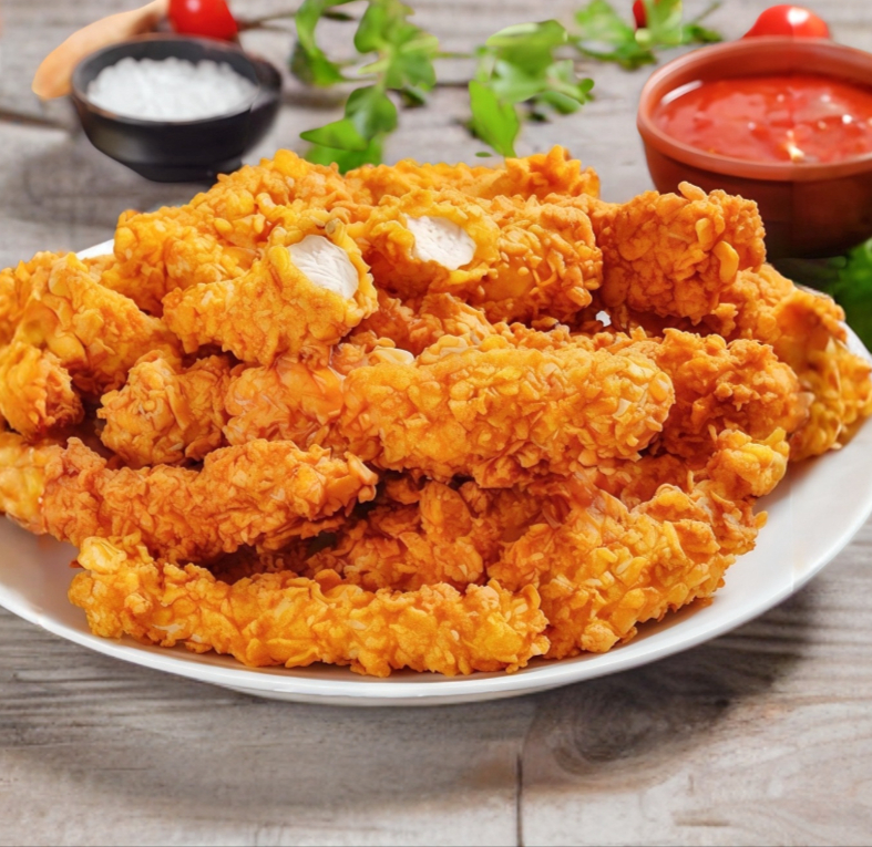 250gr de tiras de pollo bañadas en las mejores salsas, incluyen bastones de verdura y aderezo 2oz.