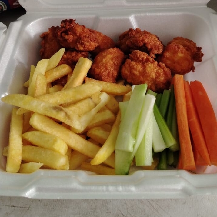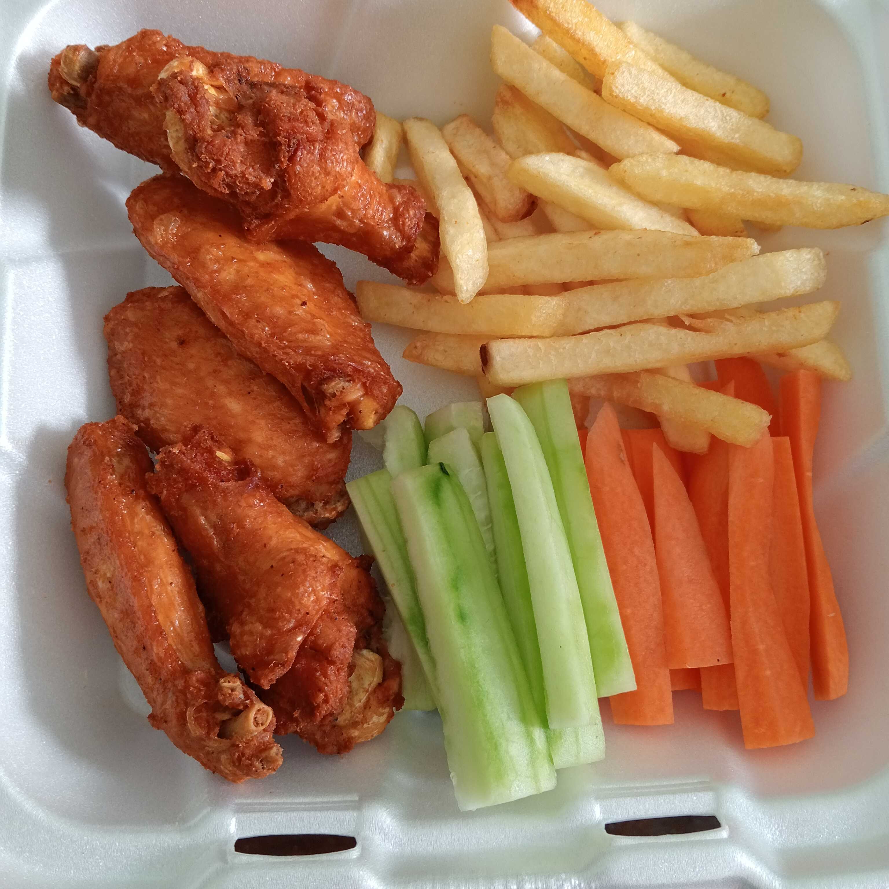6 pzas de alitas grandes con bastones de apio y zanahorias y papas a la francesa