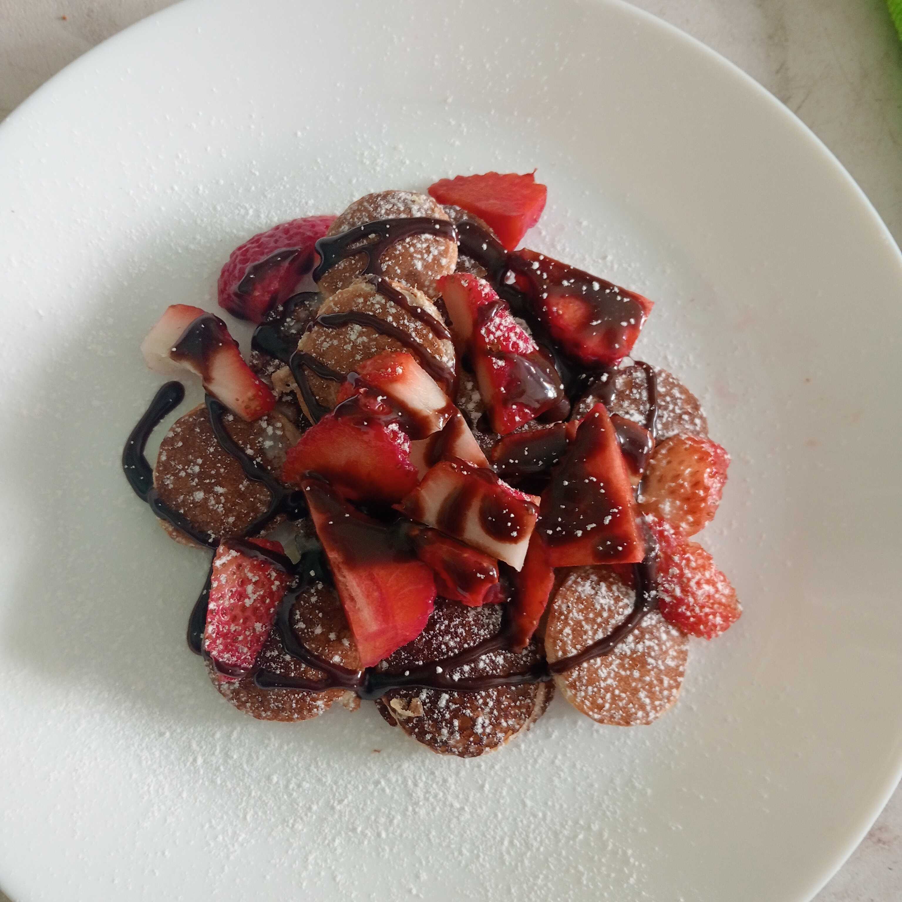 12 pzas de mini hotcakes con nutela o lechera fruta a elegir durazno, fresa o platano y nuez, galleta oreo, chispas de chocolate o almendras a elegir