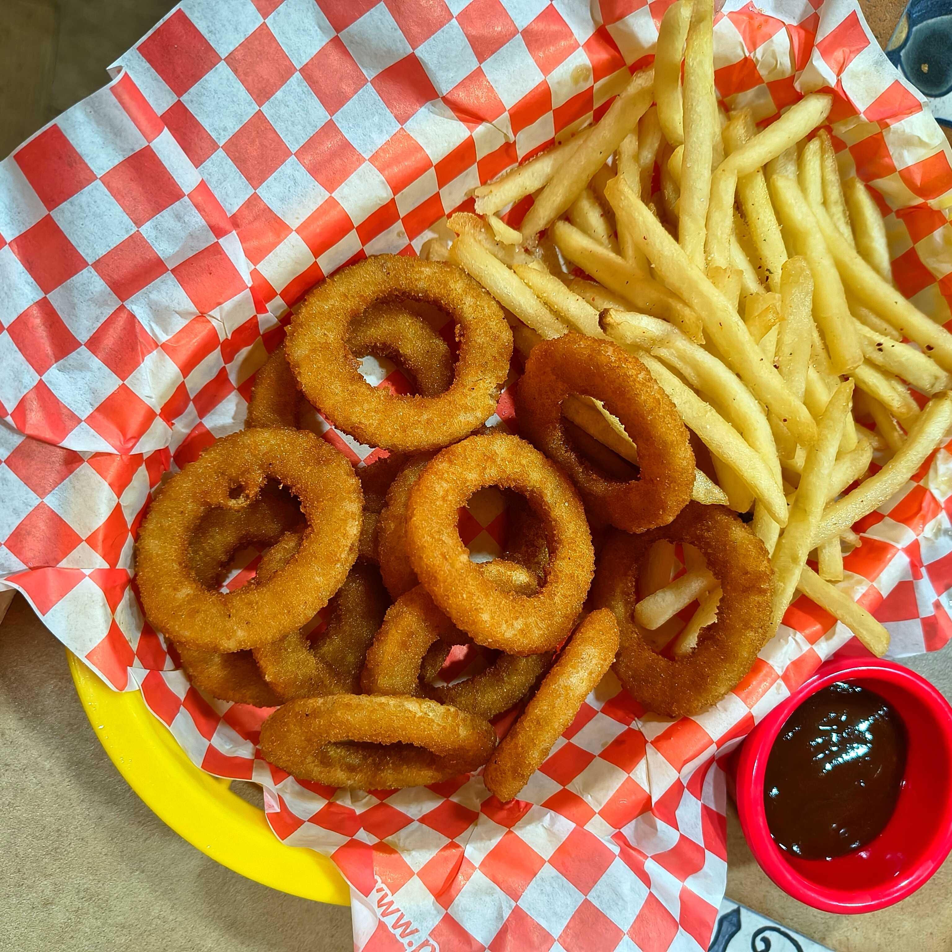 Aros de cebolla acompañados de salsa BBQ más papás a la francesa.