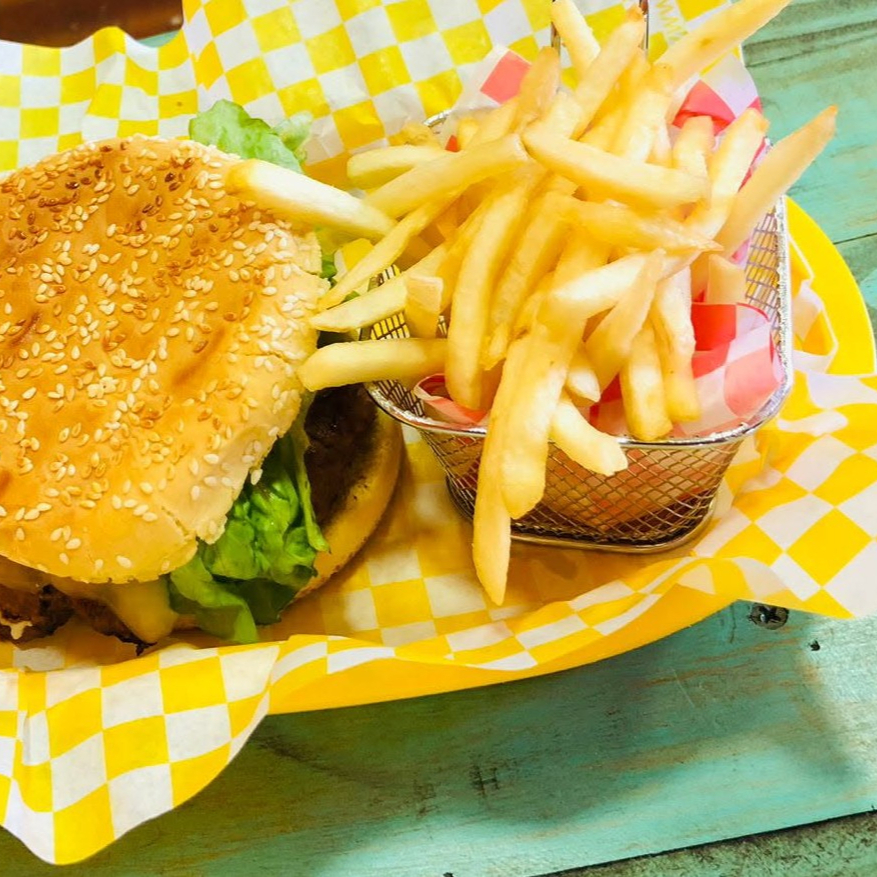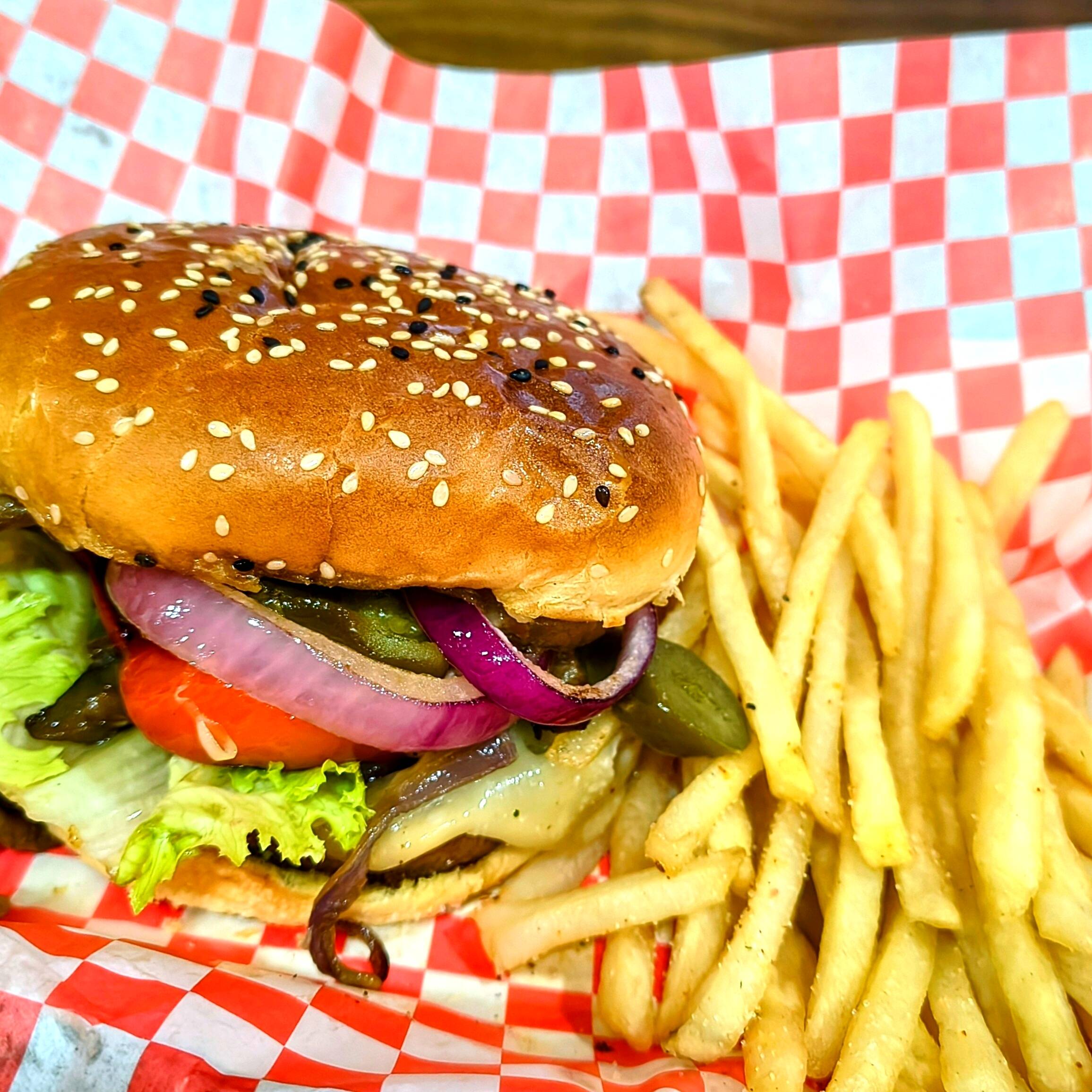 Carne con Arrachera, queso tipo americano, lechuga jitomate, cebolla, pepinillos, catsup y mostaza. Acompañado con papas a la francesa.