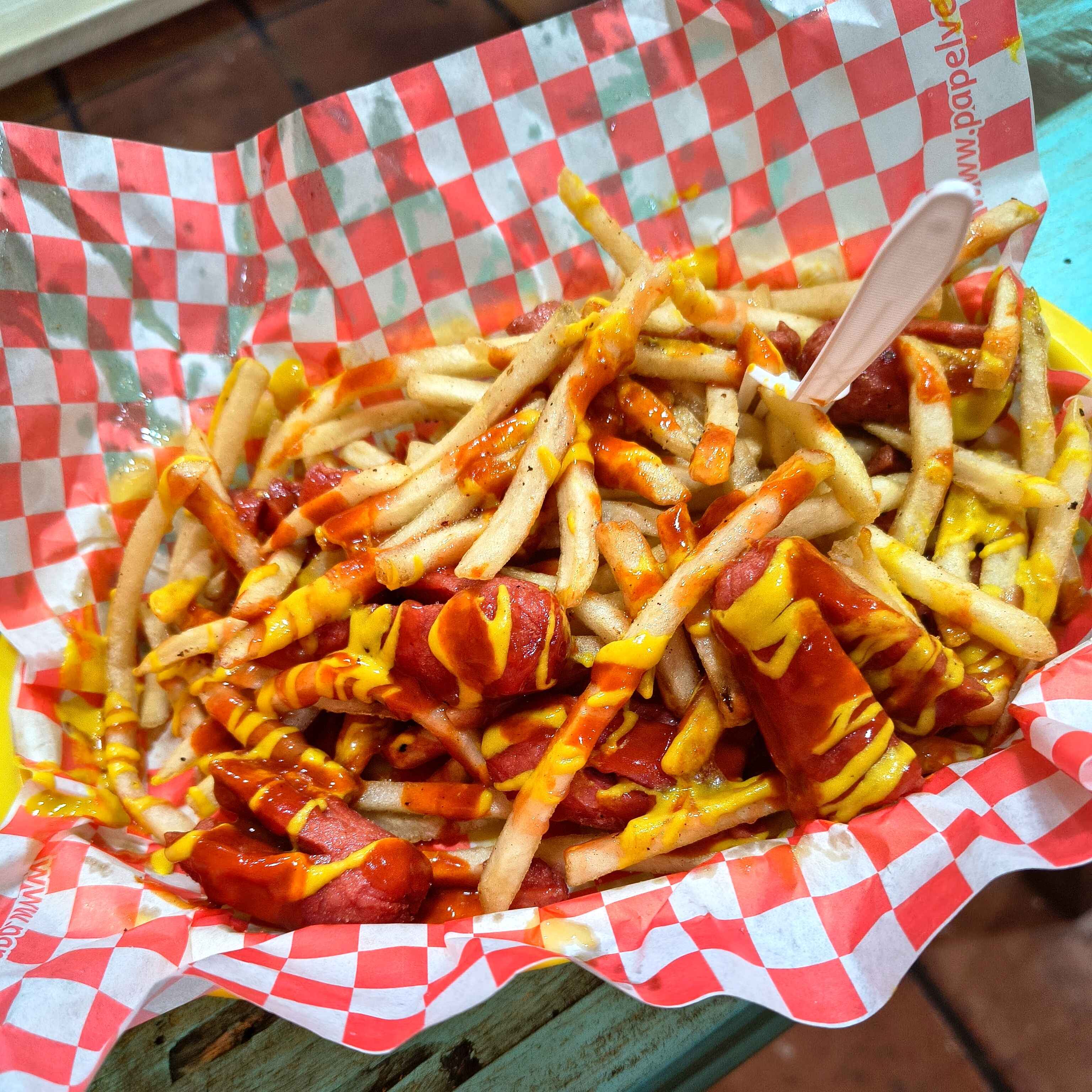 Papas a la francesa con salchicha frita. se preparan con catsup, mostaza y salsa valentina. especificar en comentarios detalles sobre salsas.