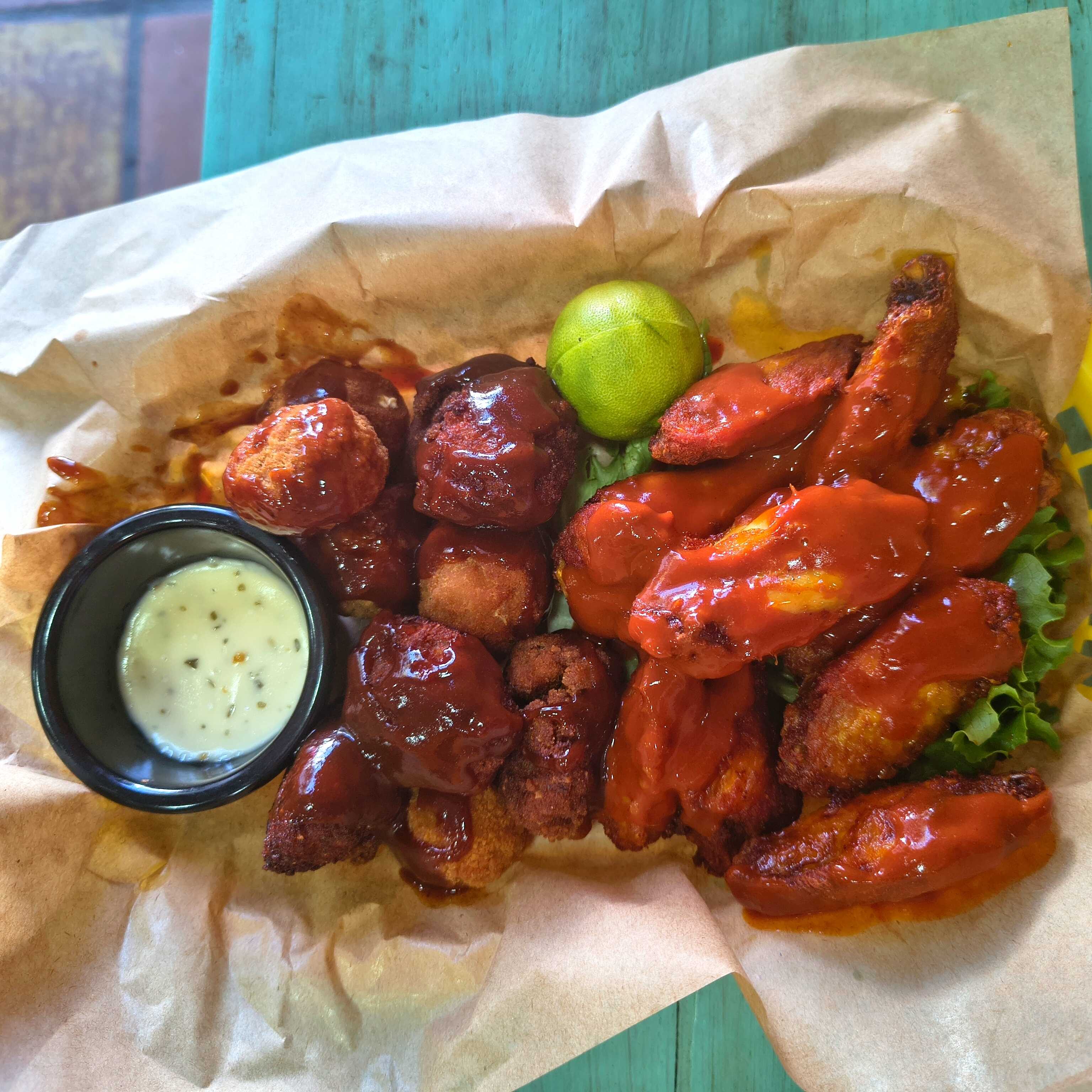 10 piezas de alitas de pollo más 350 gramos de boneless (peso en crudo) 13 piezas aprox. Elije entre salsa picante (salsa acidita con chiles secos, incluye aderezo ranch), salsa BBQ, o salsa valentina con limon (solo para alitas). Escoje una salsa para tus alitas y otra para tus boneless, especificar en comentarios.