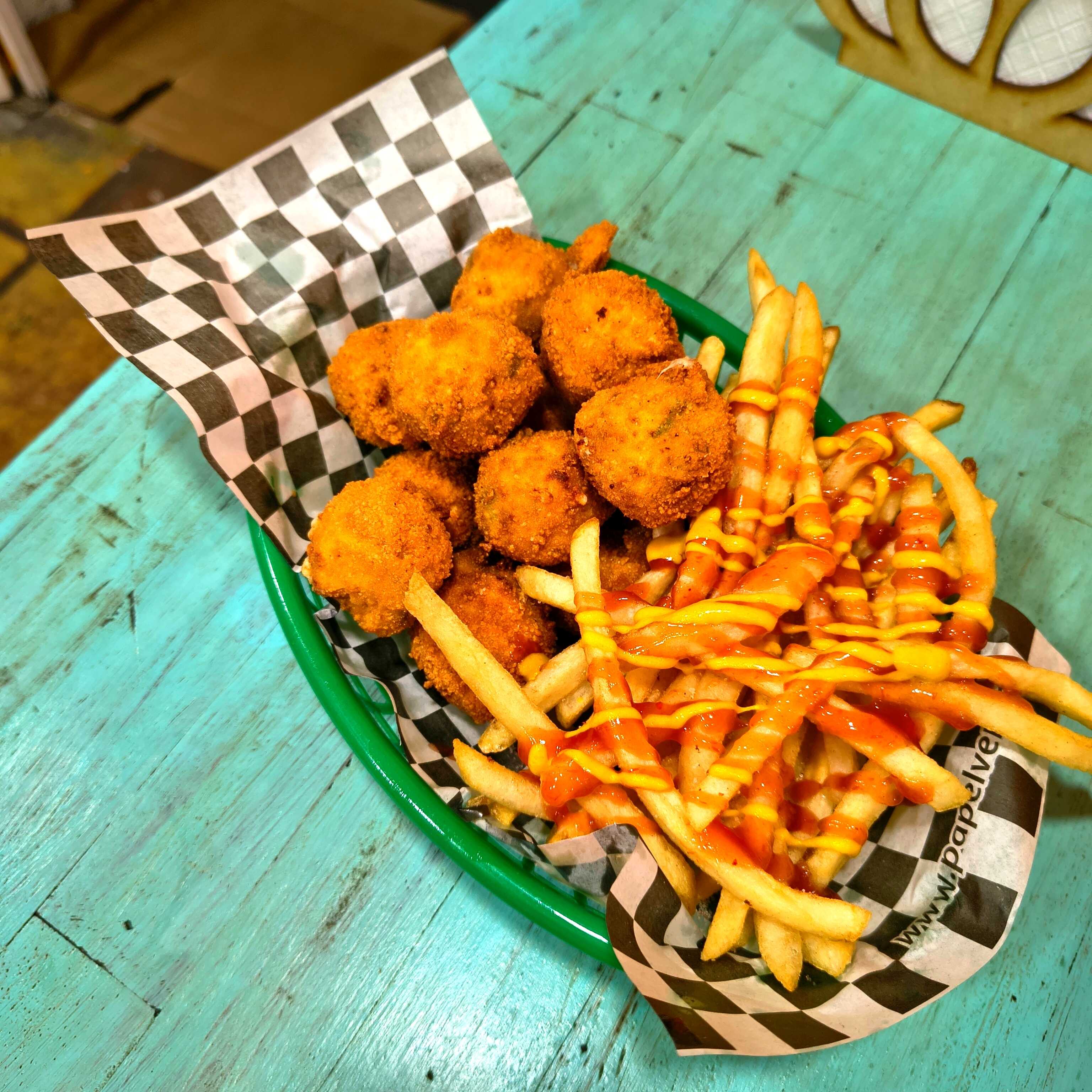 200 gramos de jalapeño bites, una mezcla de jalapeños, quesos, carne de res. Incluyen papas a la francesa para acompañar