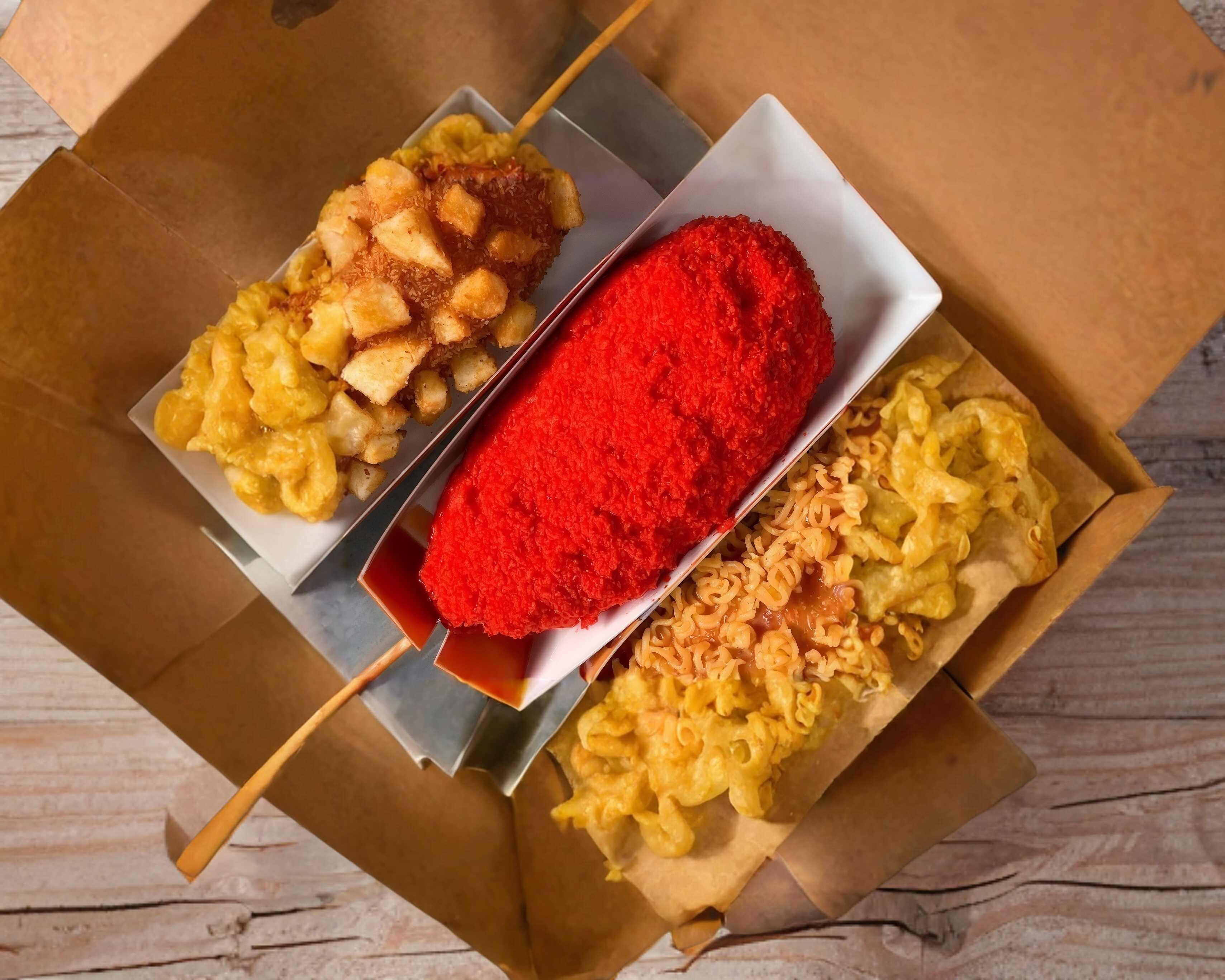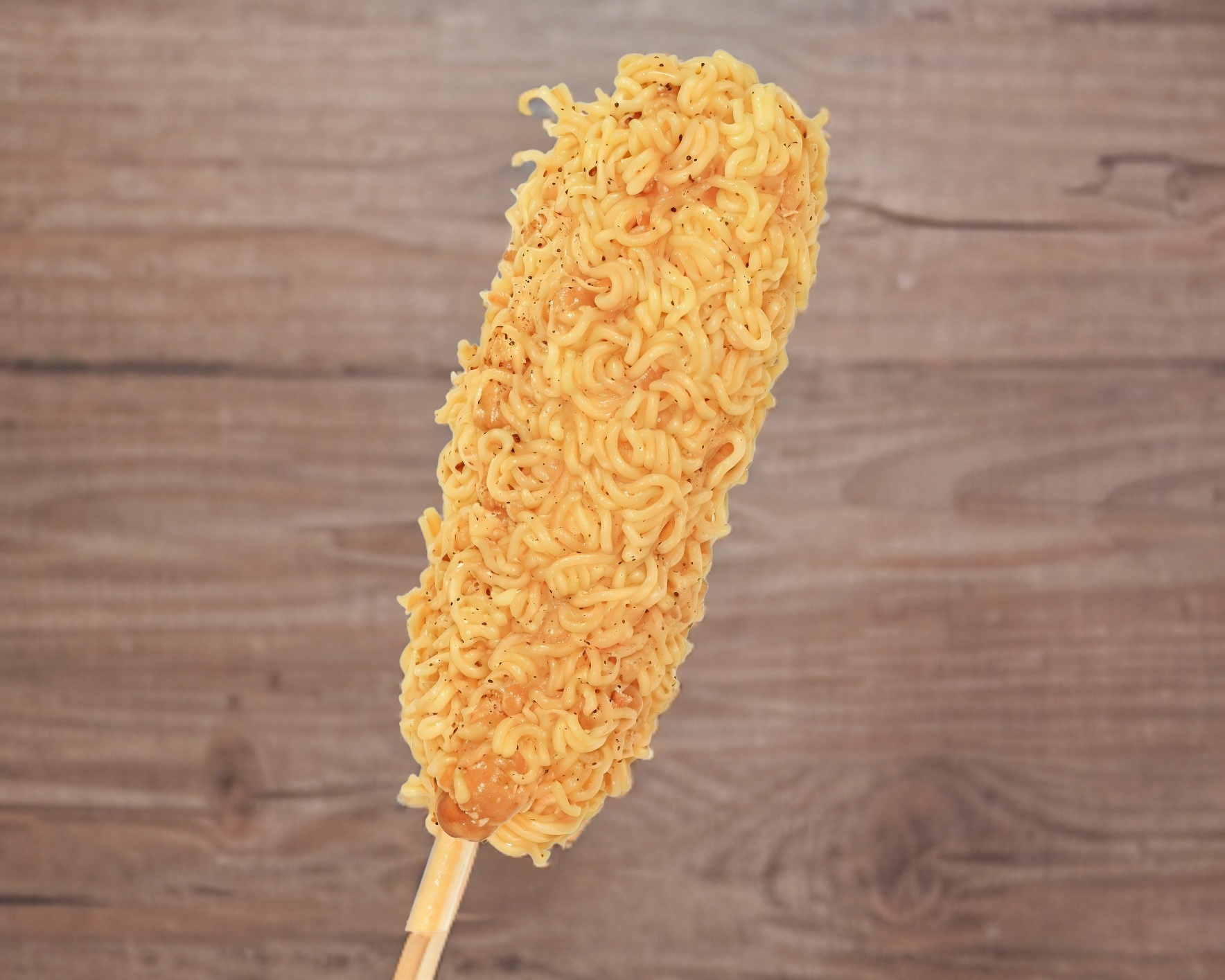 Relleno a elegir envuelto en nuestra masa, empanizador y fideos de ramen crujiente.