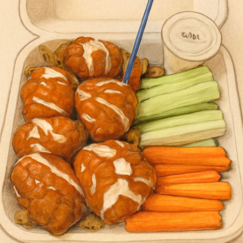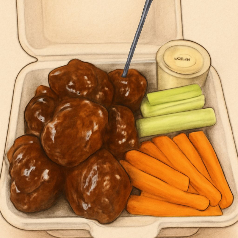 18 piezas de Boneless bañados en salsa de tu elección acompañados de aderezo Ranch, Zanahoria y Pepino