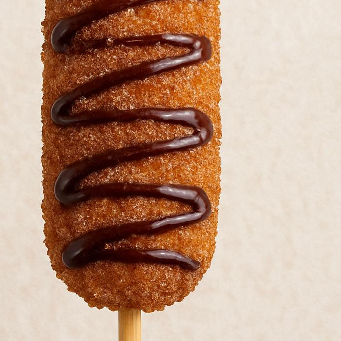 Banderilla rellena de queso envuelta en nuestra masa, espolvoreada de azucar con canela y chocolate.