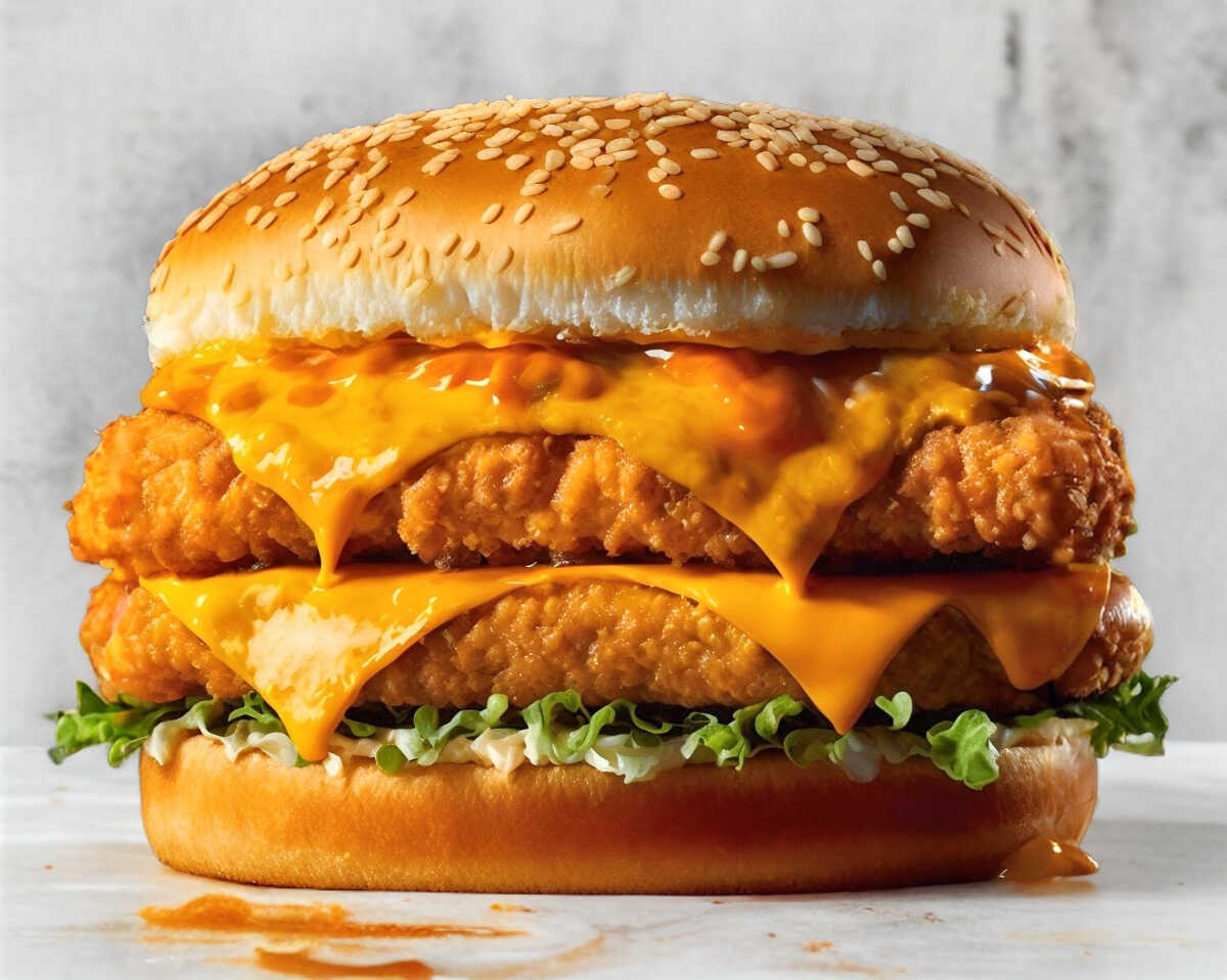 Doble nugget de pollo, queso americano, lechuga, jitomate y cebolla caramelizada.