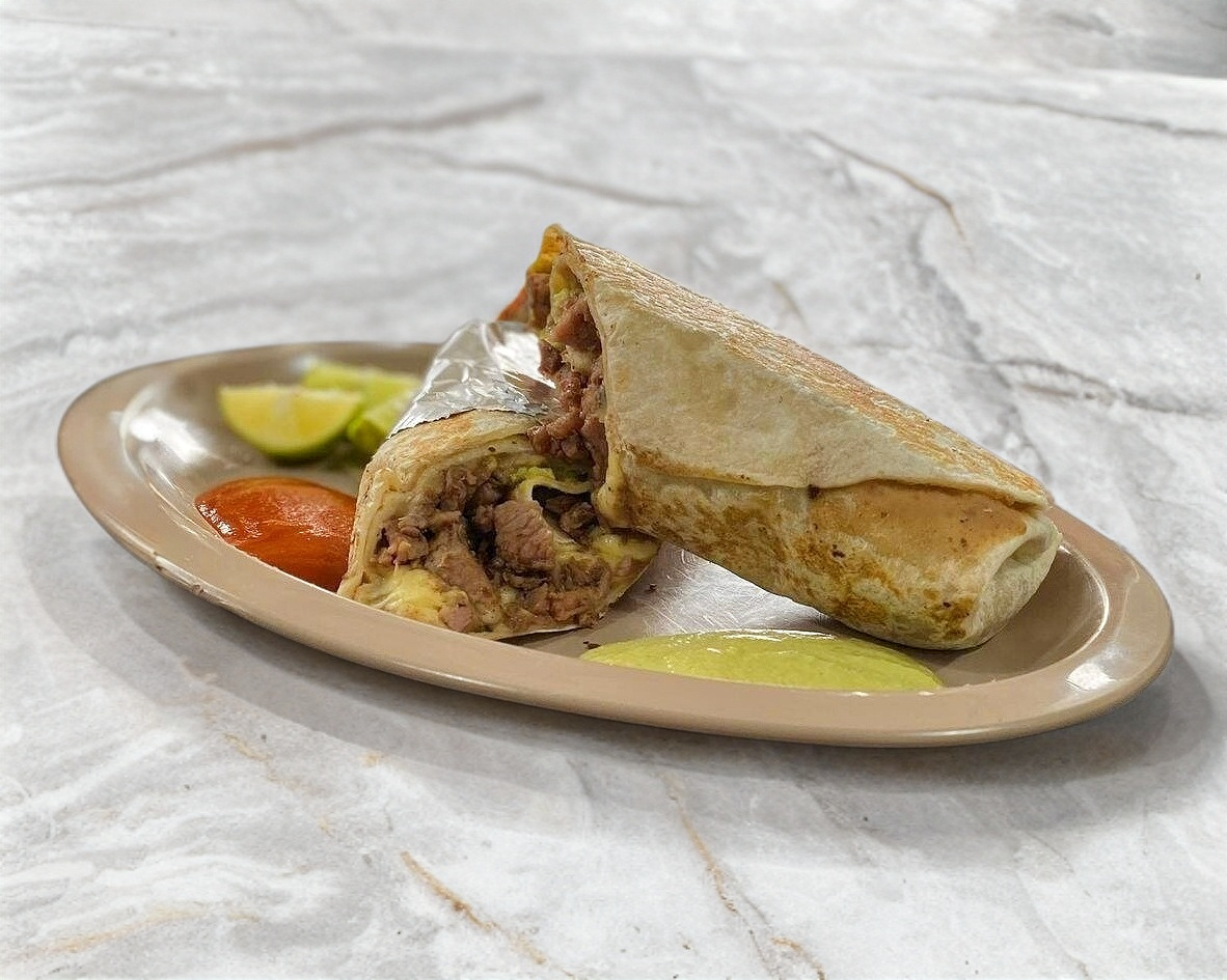 Burrito de tortilla grande , la carne de tu elección , LECHUGA y una mezcla de queso Oaxaca y asadero fundido.