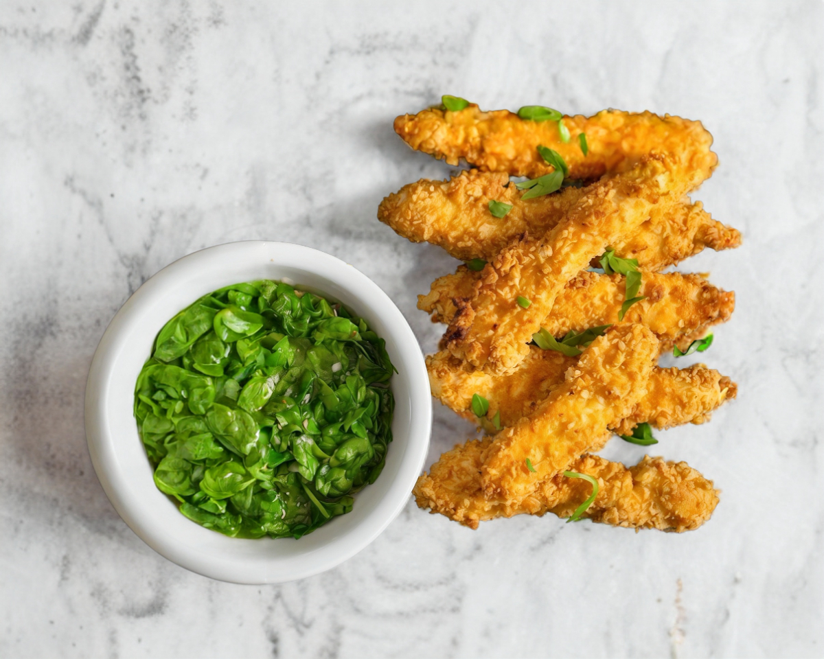 Papas a la francesa, sazonador a elegir, dip a elegir, queso gratinado y chicken tiras - 350 g.