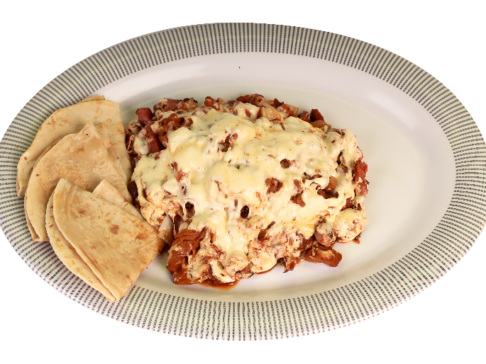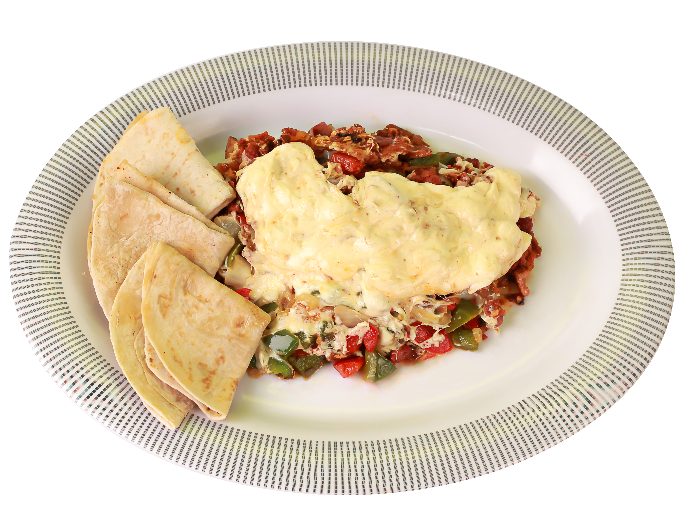 Bistec de cerdo, mezcla de quesos, frijoles, arroz y un salteado de morrón con chile jalapeño