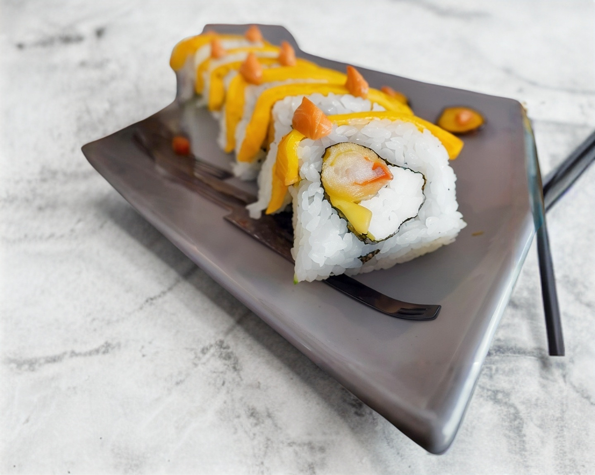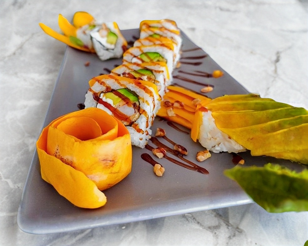 Fuera: Mango / Dentro: Camarón Empanizado, Queso Crema y Aguacate / Acompañado: Salsa Dulce y Nuez
