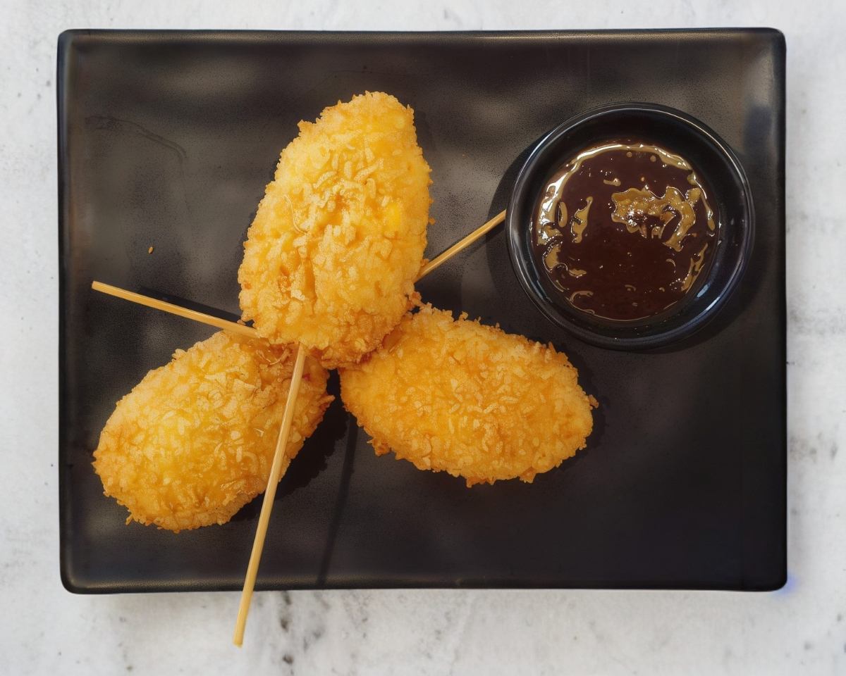 3 Brochetas fritas queso gouda empanizadas con panko.