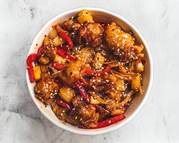 Arroz blanco con cubos de pierna de cerdo capeados en salsa agridulce con cebolla, cebollín, piña, jícama y pimiento ligeramente picante con ajonjolí