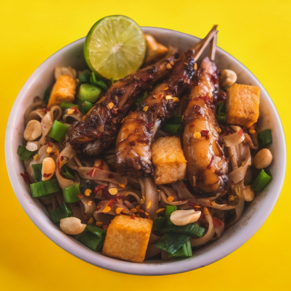 Base de tallarín de arroz, tofu, camarón y ajo con huevo, germen, cebollín y cacahuates en salsa de pescado y tamarindo con ajonjolí, chile y limón.