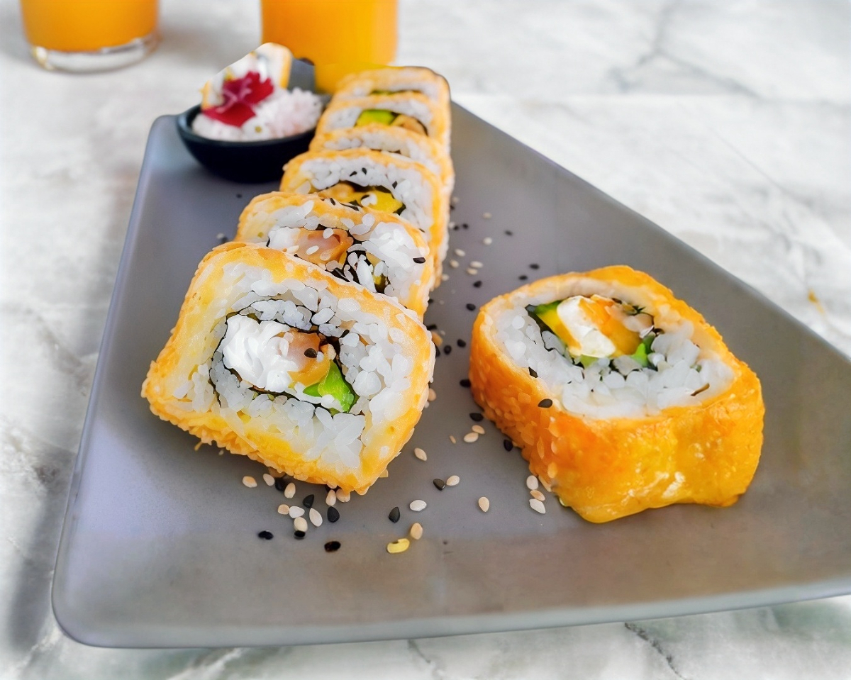 Fuera: Empanizado con Panko / Dentro: Camarón Empanizado, Queso Crema y Aguacate / Acompañado: Salsa Tampico y Ajonjolí