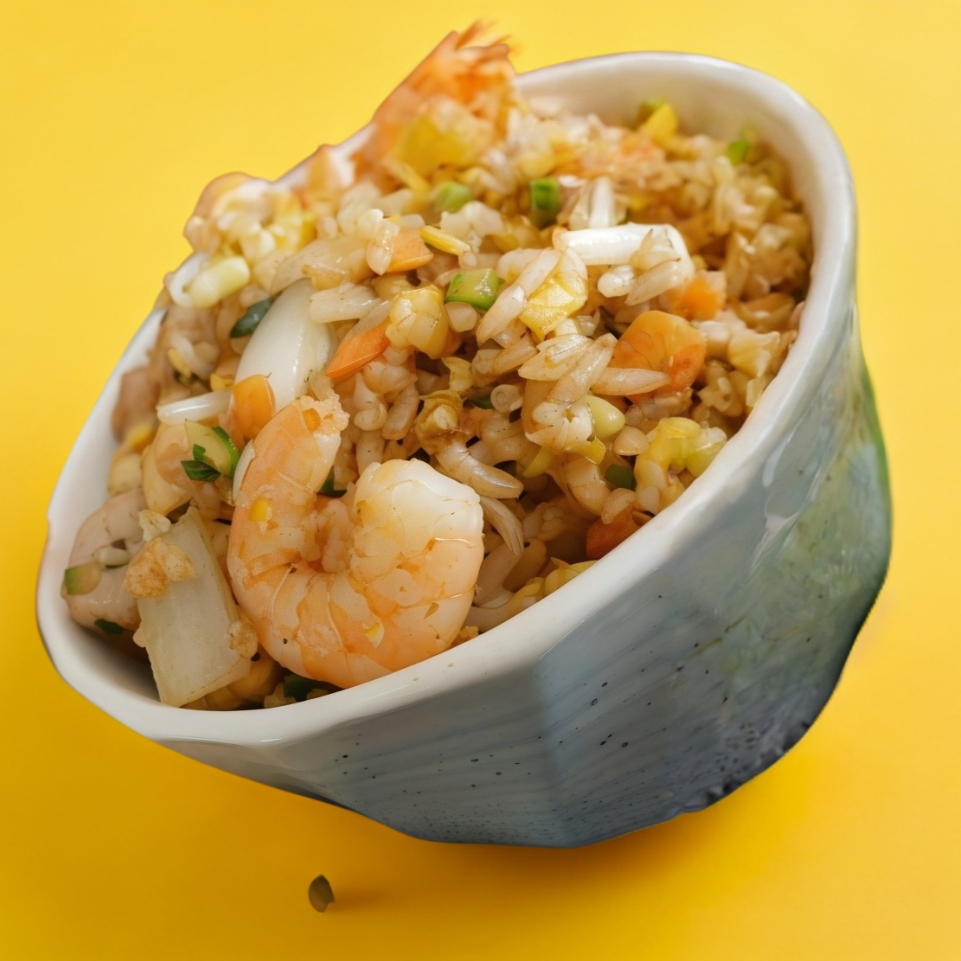Yakimeshi al estilo Sr Wok arroz blanco frito con pollo, cerdo y camarón,verduras frescas y huevo batido sazonado con salsa de soya.