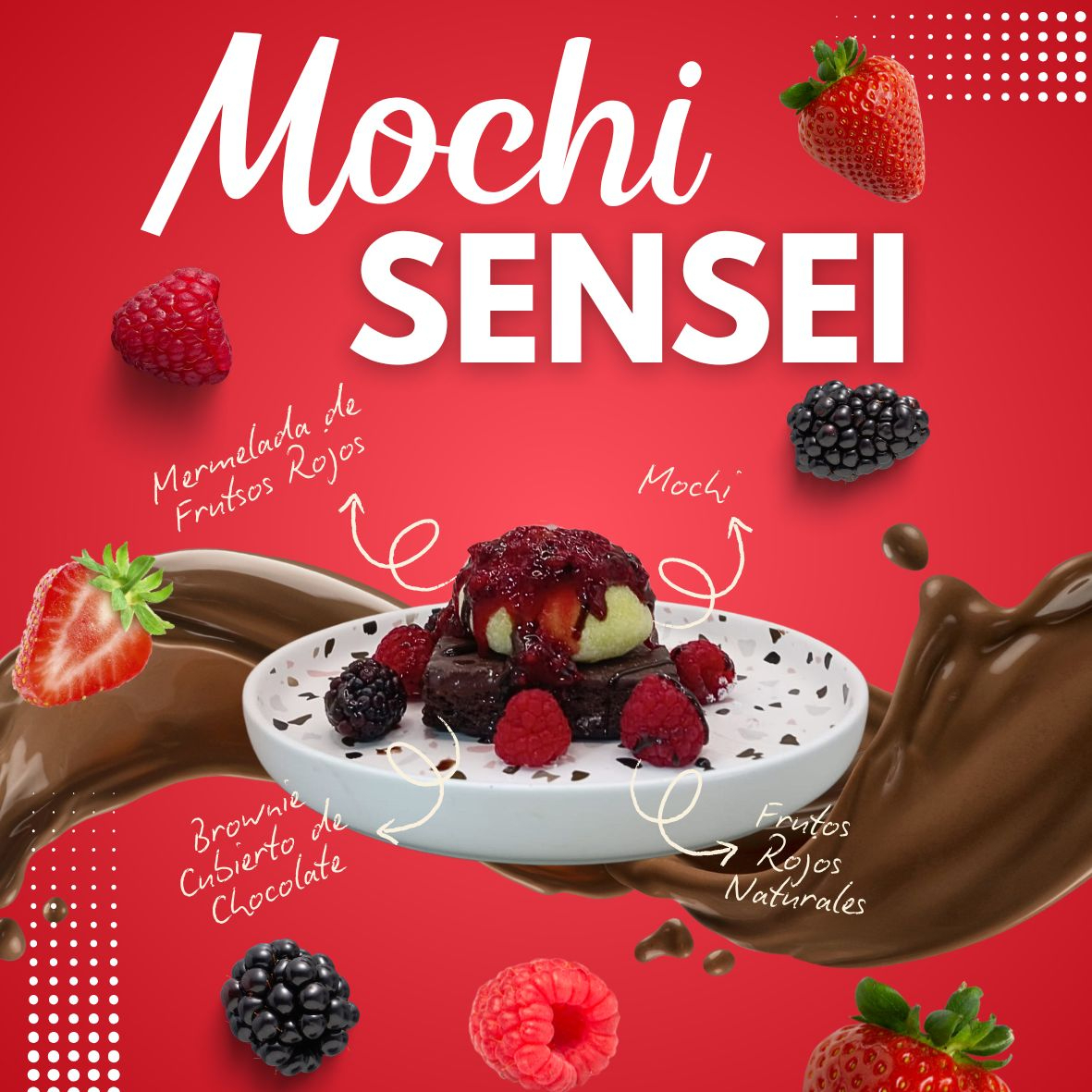 Brownie Cubierto de ChocolateCon un mochi helado y Frutos rojos, Bañado en Mermelada de Frutos.