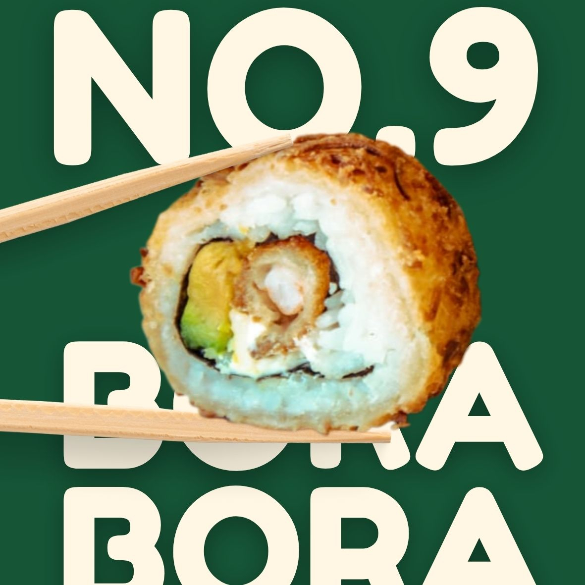 Fuera: Camarón; Empanizado con Panko y Coco Rayado / Dentro: Aguacate y Queso Crema / Acompañado: Salsa Bora Bora