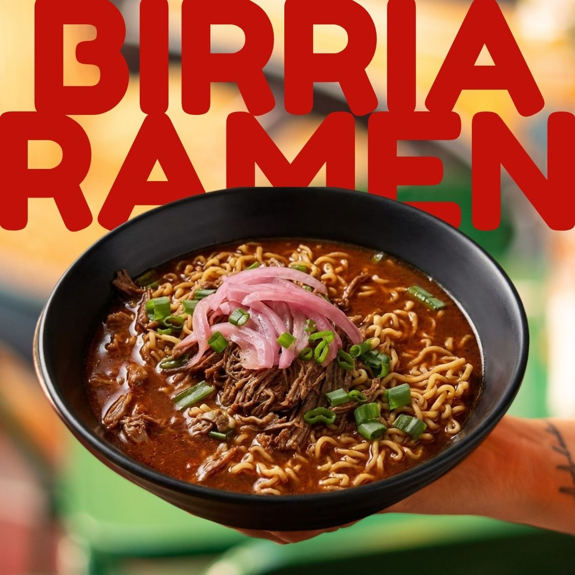 Deliciosa birria de res acompañada de pasta ramen, decorado con cebolla, cilantro y cebolla morada
