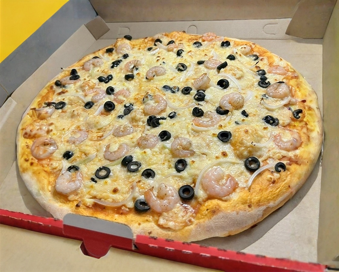 Pizza grande 8 rebanadas de Aceitunas negras, camarón, cebolla y queso.